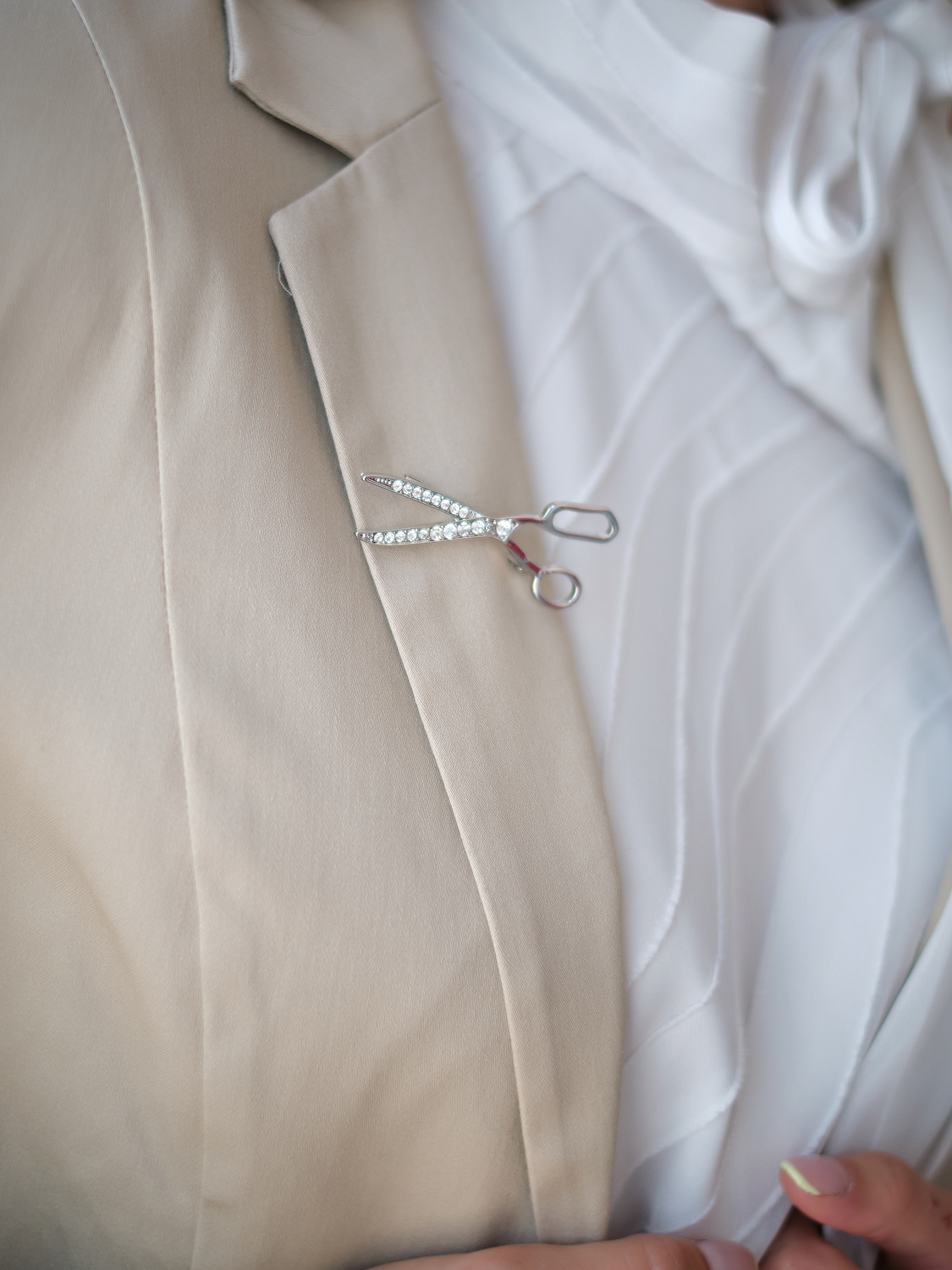 Оригинальная брошь в виде ножниц станет стильной деталью вашего образа. Брошь украшена стразами.