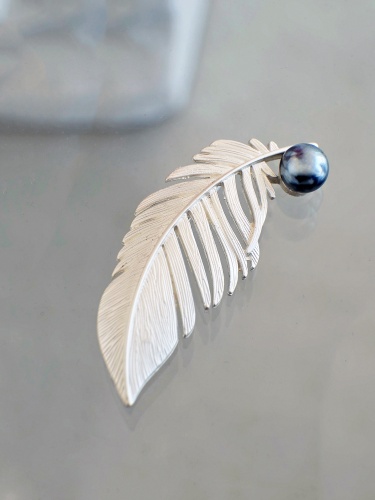 Изящная брошь в виде перышка с контрастным искусственным жемчугом. Добавит образу женственность и невесомость.