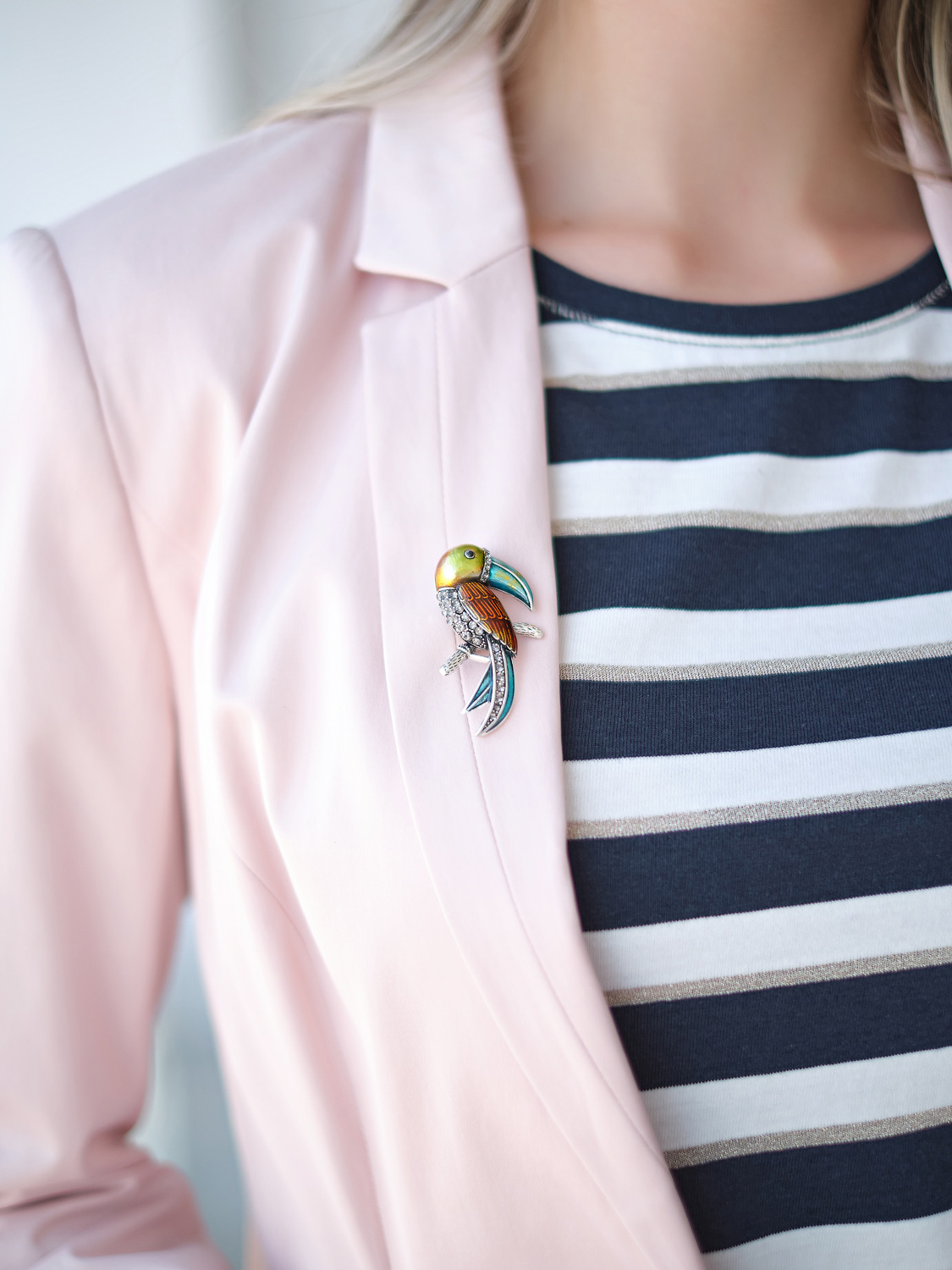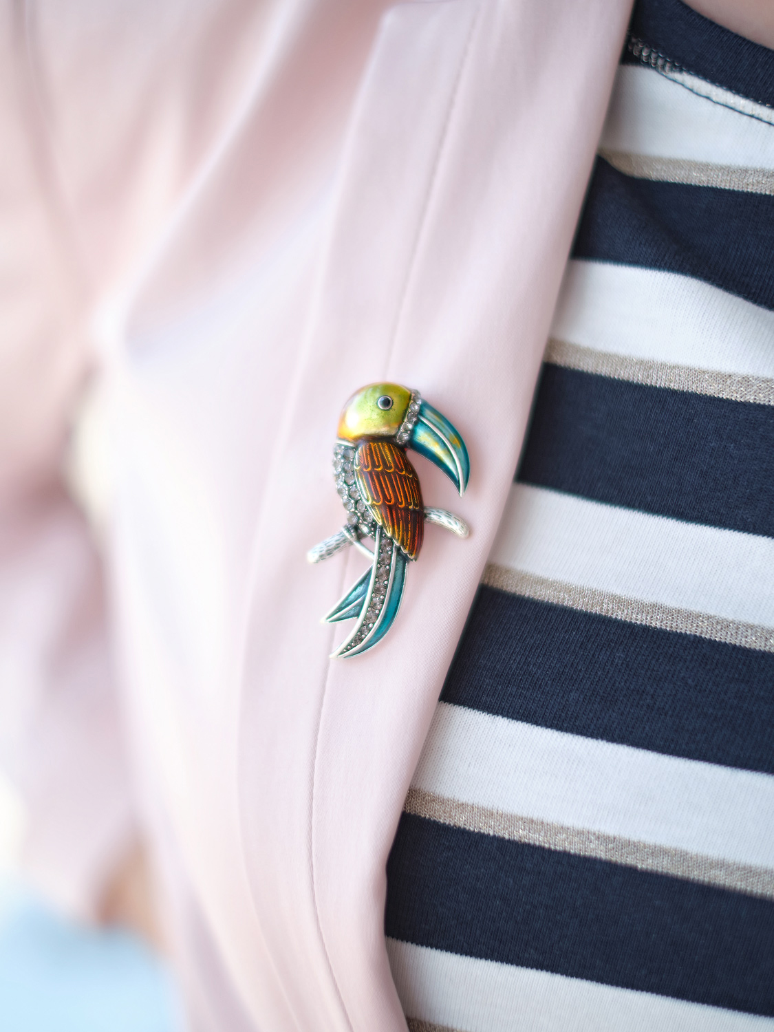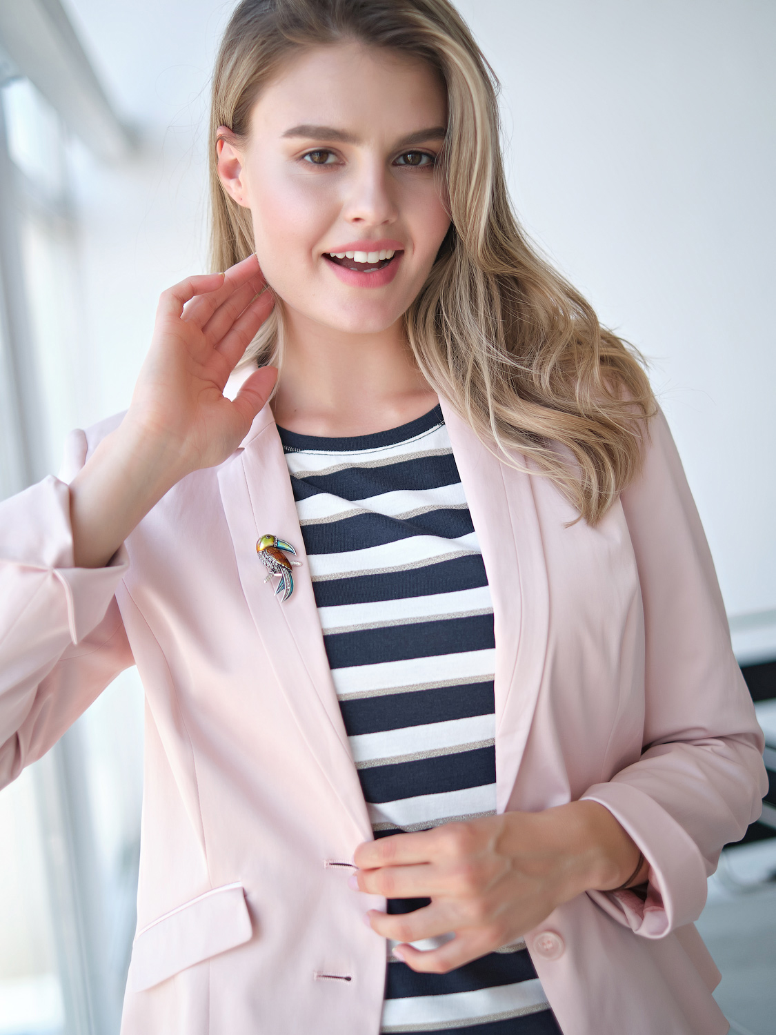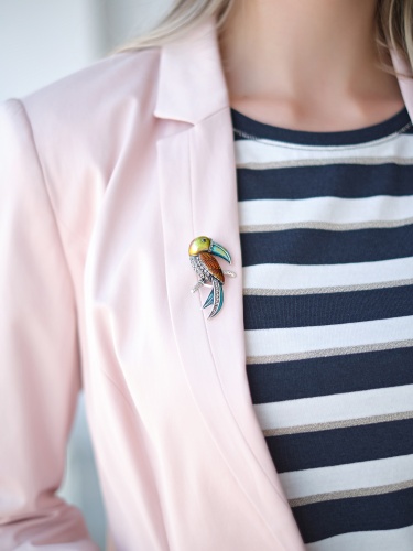Стильная и яркая брошь в виде птицы – трендовый элемент для вашего образа. Брошь выполнена из комбинированных материалов, украшена стразами.