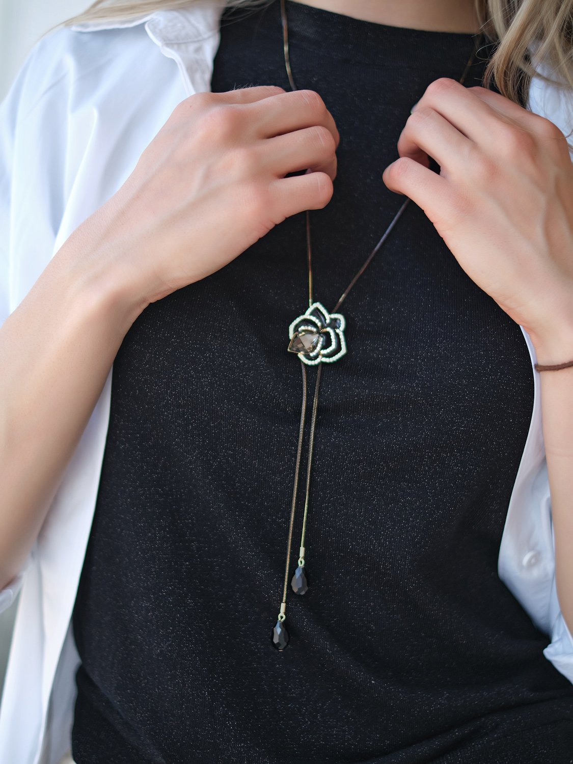 Стильная подвеска в виде цветка. Выполнена из комбинированных материалов с использованием горного хрусталя.