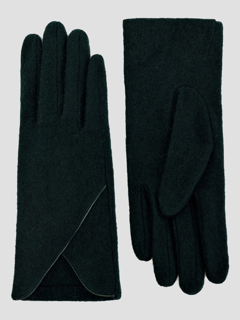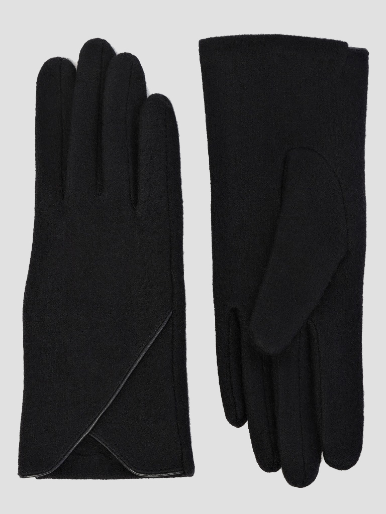Модель без подкладки. Отделка - декоративный кант на манжете, расходящийся от линии разреза на лицевой стороне перчатки, выполненный из экокожи. Длина манжеты от нижней точки большого пальца до края перчатки - 6,5 см. Длина пальцев - средняя.