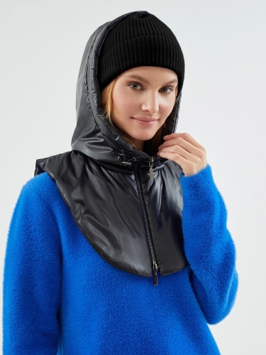 Съемный капюшон с манишкой из плащевой ткани черного цвета. Капюшон на молнии, имеет резинку и два фиксатора для регулирования объема капюшона. Капюшон очень теплый, внутрь встроены непродуваемая мембрана и утеплитель для защиты от ветра и дождя.