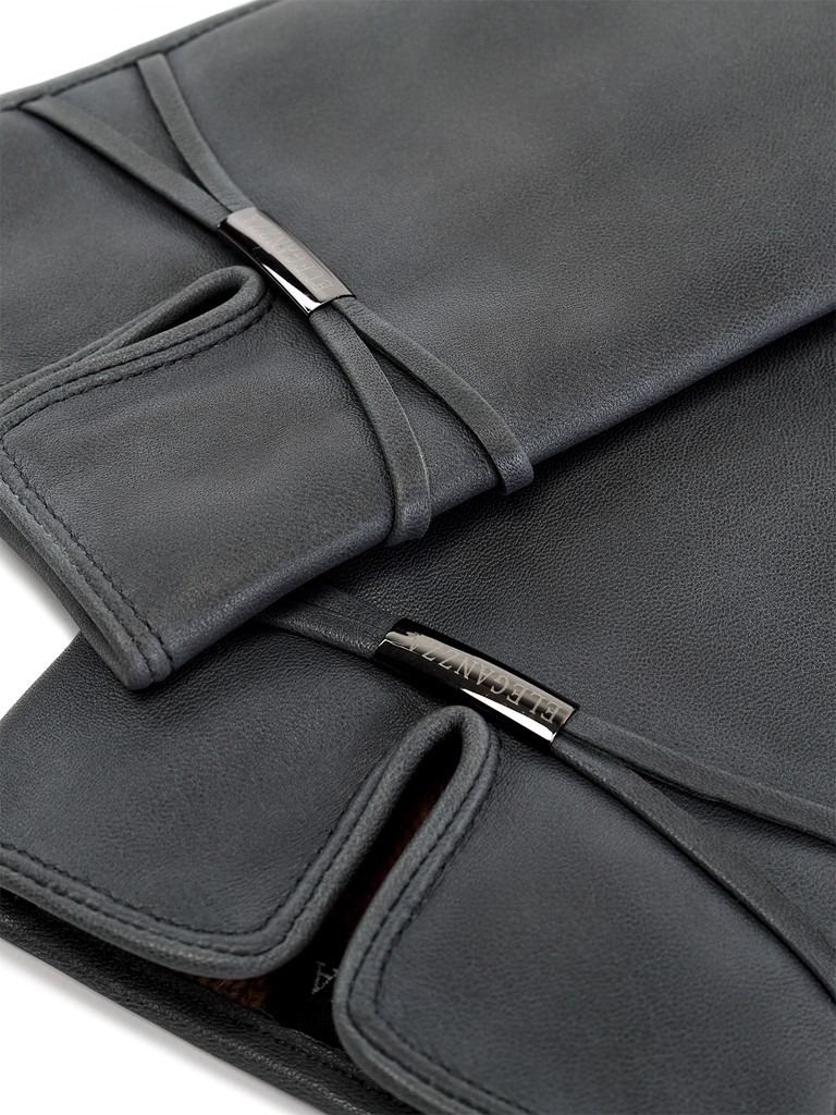 Перчатки выполнены из кожи ягнёнка. Подкладка: 100% шерсть. Декоративные элементы - фирменная фурнитура на узких кожаных ремнях. Нижний край перчатки и разрез на лицевой стороне окантованы. Длина манжеты от нижней точки большого пальца до края перчаток - 6 см.