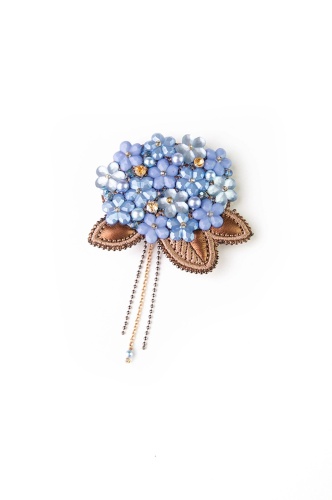 Дизайнерская брошь ручной работы «Гортензия». На кожаной основе выполнена декоративная вышивка с аппликацией из бусин, страз и бисера. По краю брошь окантована металлической тесьмой.