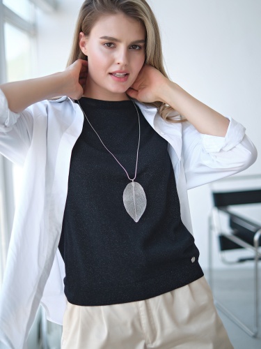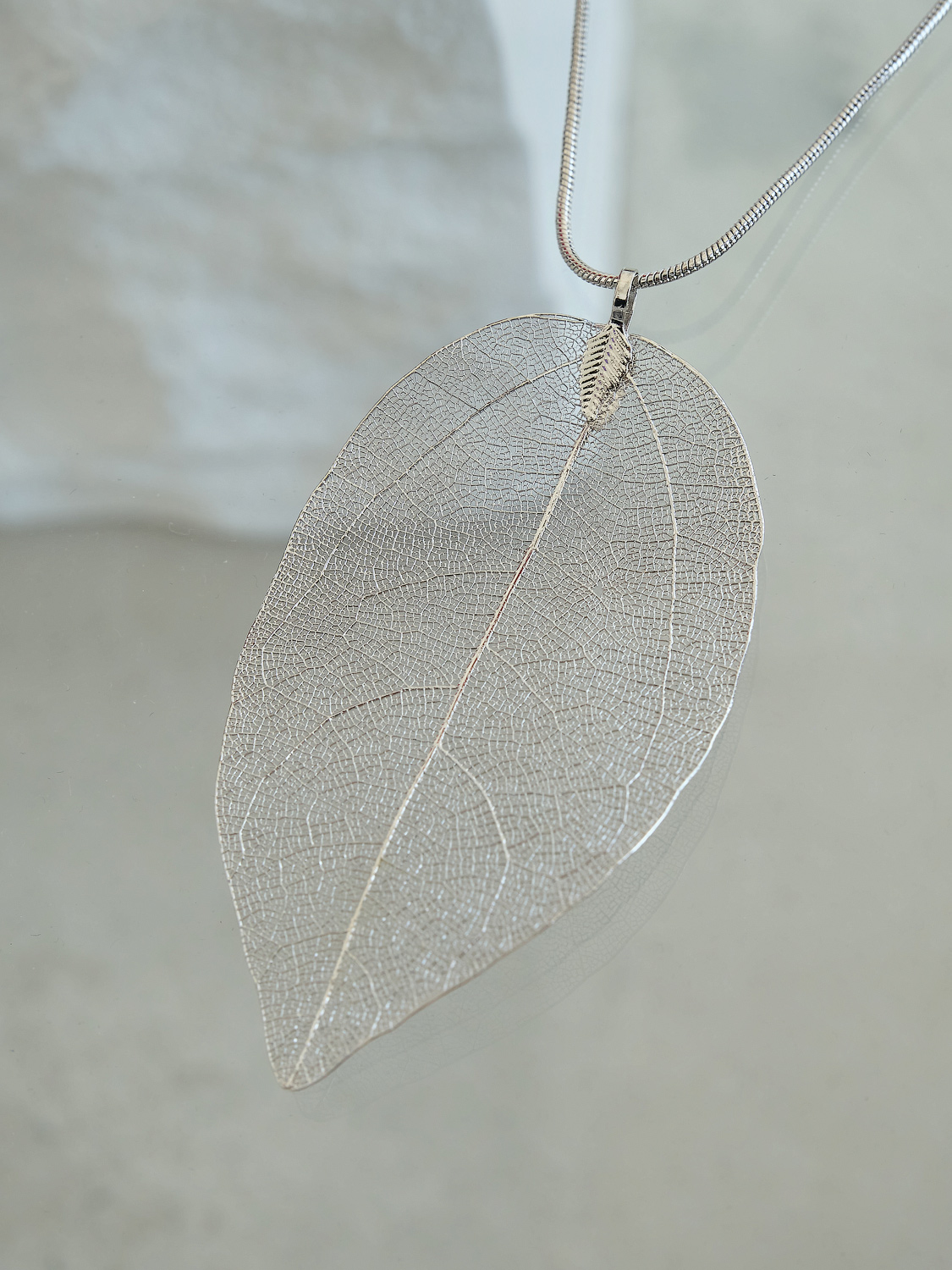 Украшение-подвеска в виде изящного ажурного листа создает утонченный и воздушный образ.