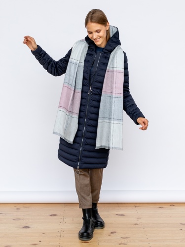 Теплый шарф из приятной на ощупь ткани. Орнамент в крупную клетку белого, серого и розового цветов. Декор - вышивка нитью. Шарф является незаменимой вещью в холодное время года.