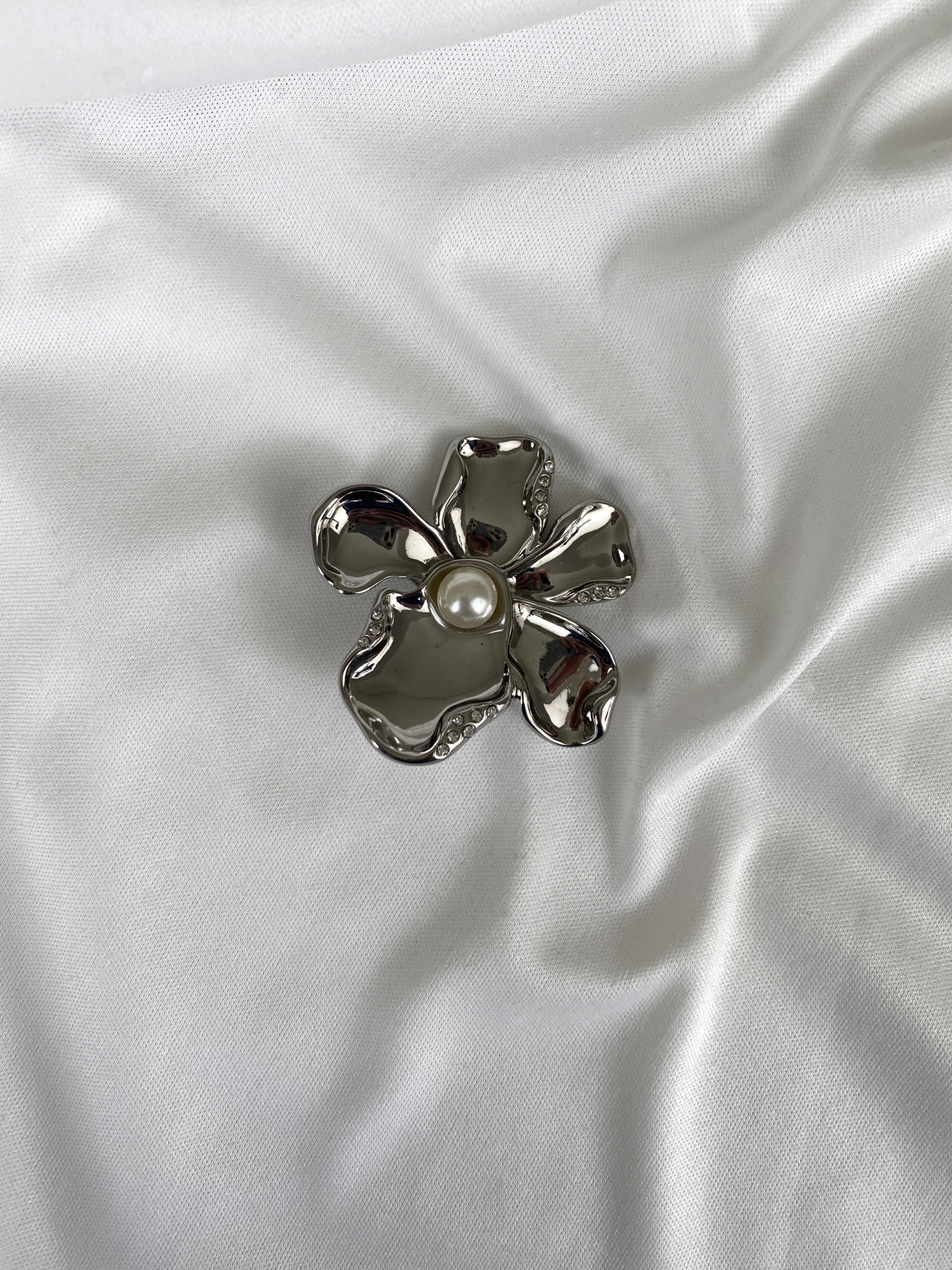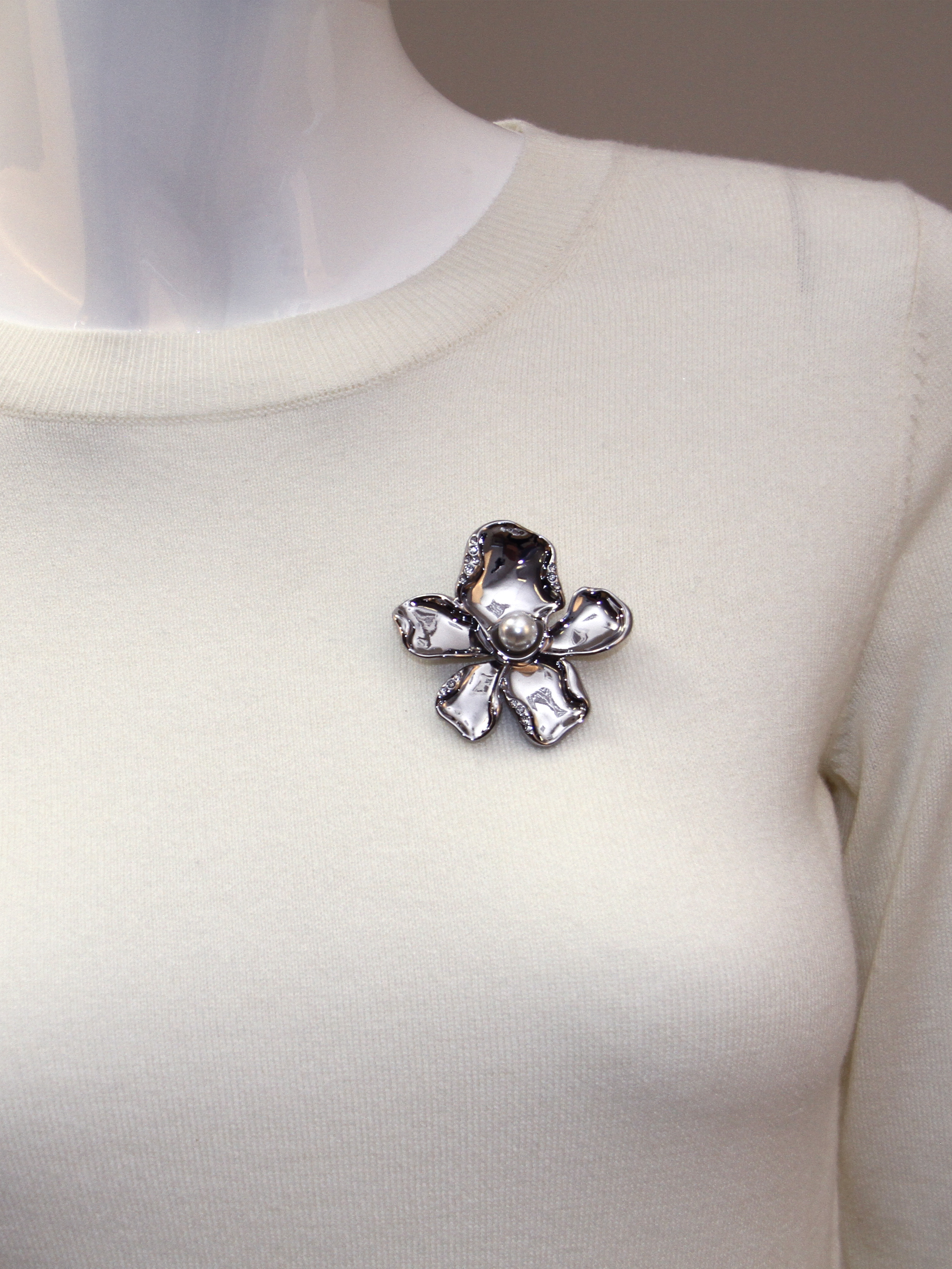 Оригинальная брошь в виде цветка с центральной жемчужиной. Выполнена из комбинированных материалов с использованием искуственного жемчуга.