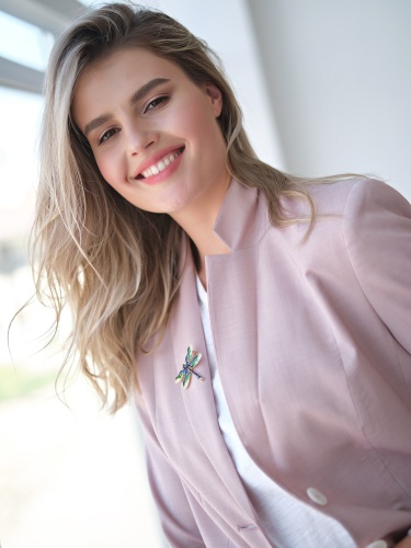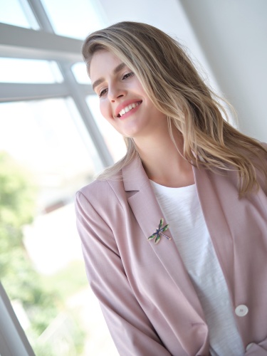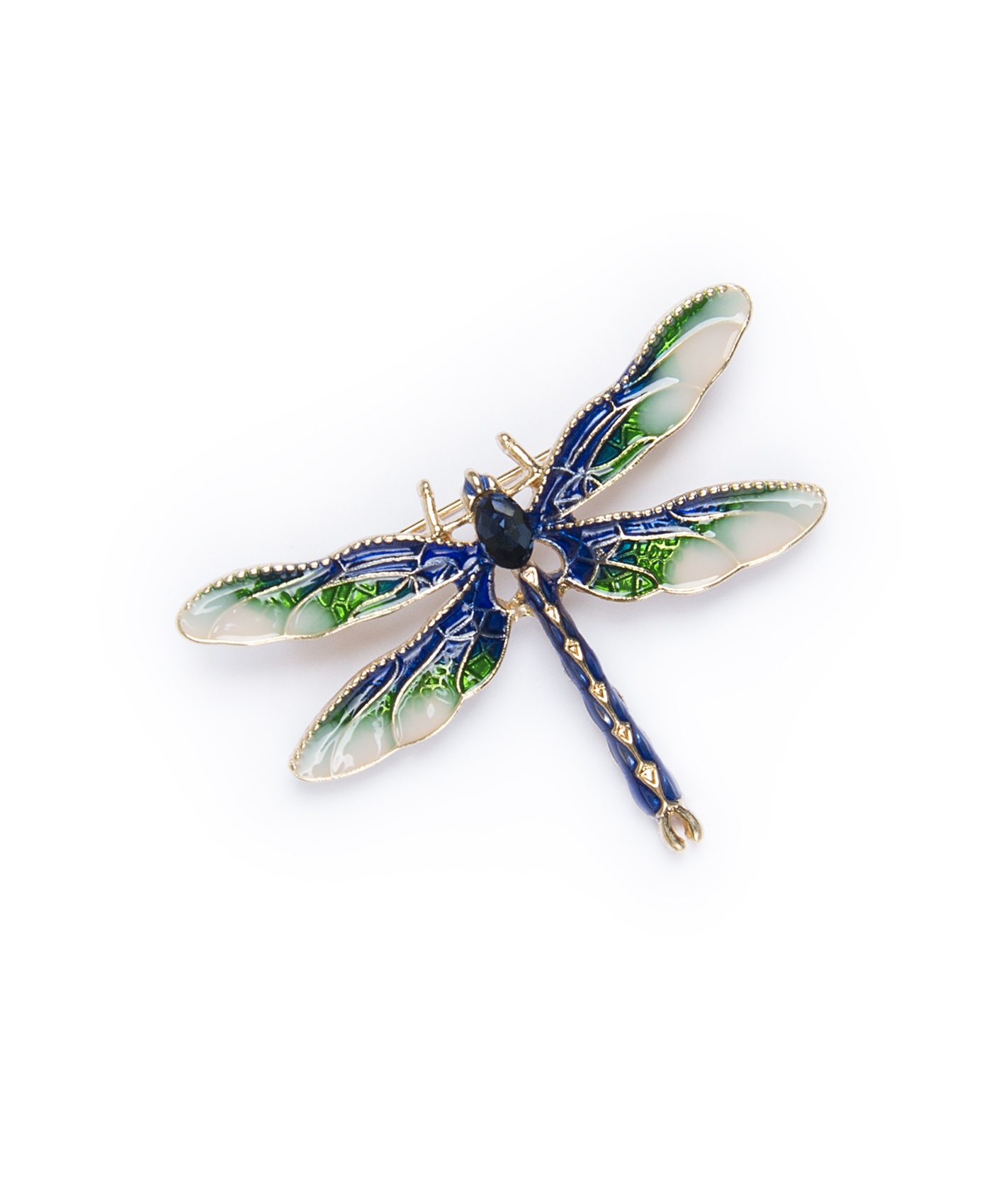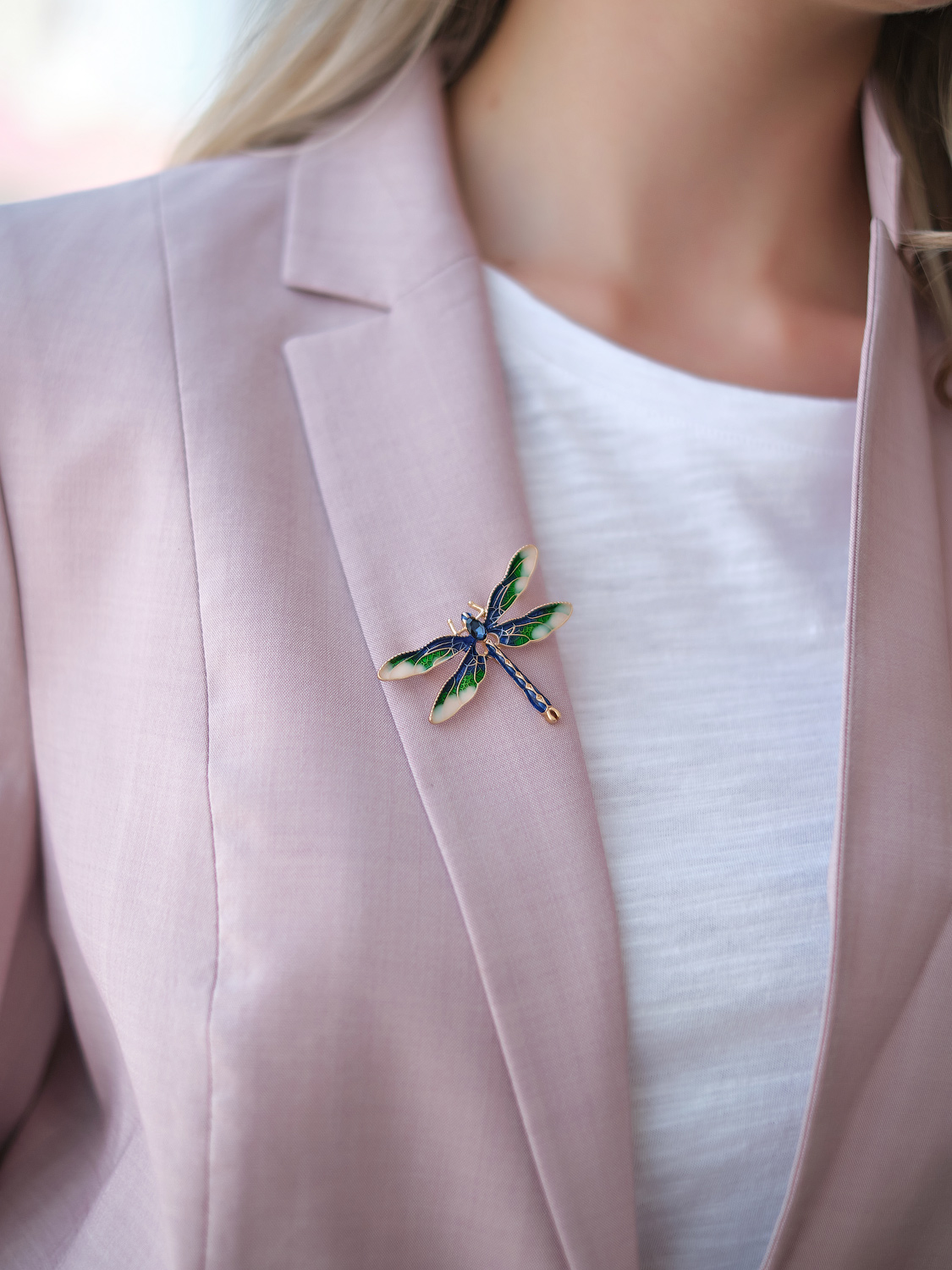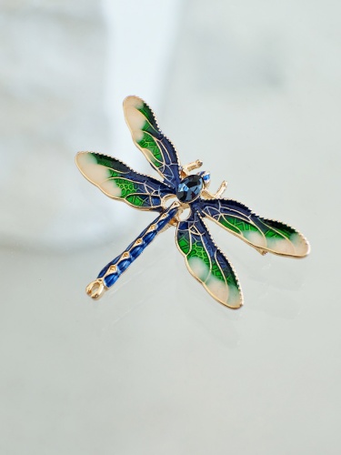Украшение-брошь в виде стрекозы со вставкой горного хрусталя станет интересным акцентом в повседневном образе.