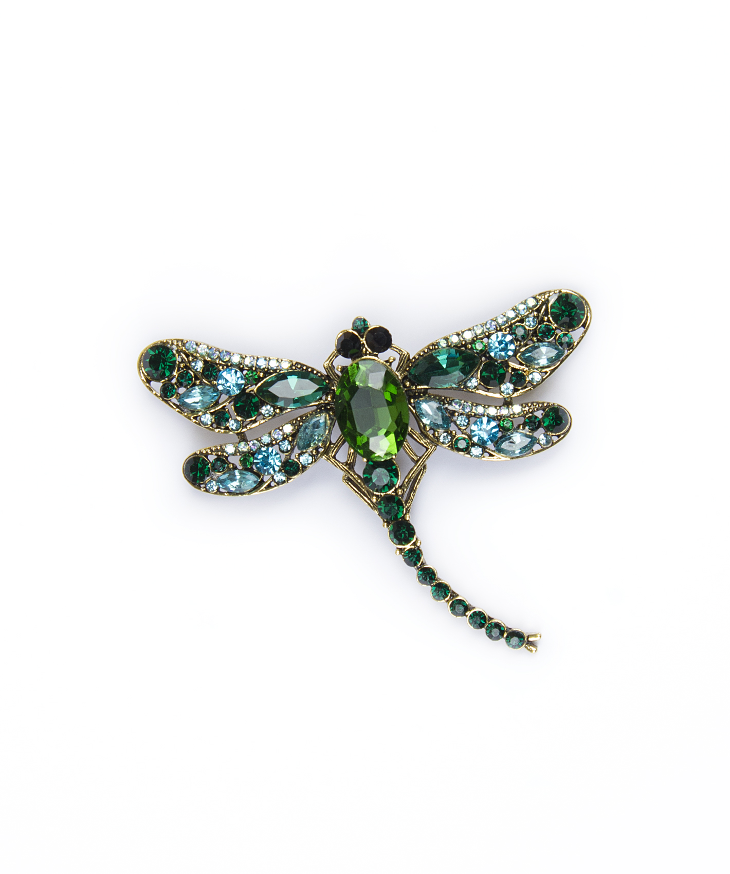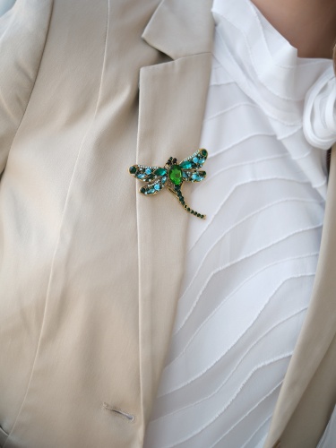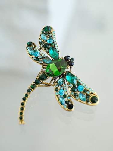 Ажурная брошь в форме стрекозы, украшенная вставками горного хрусталя, станет интересным и ярким акцентом в вашем образе.