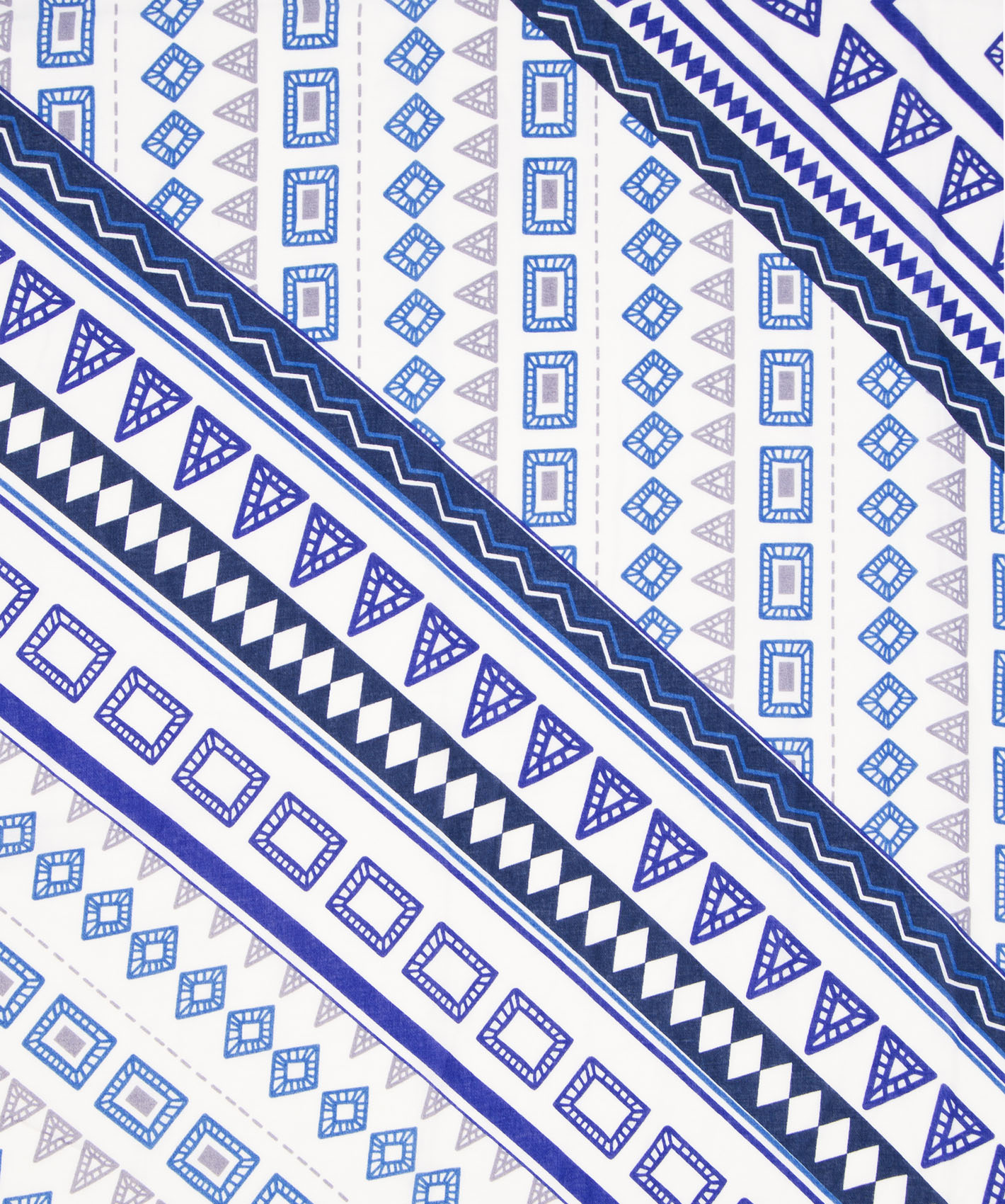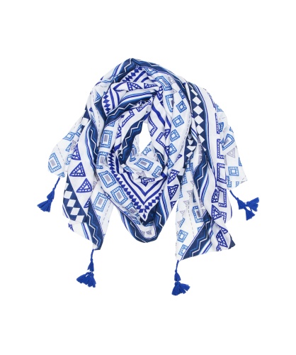Легкий шарф из приятной на ощупь ткани. Геометрический орнамент в оттенках синего, декор: кисточки. Шарф прекрасно подойдет к весенне-осеннему гардеробу и подчеркнет деловой стиль в одежде.
