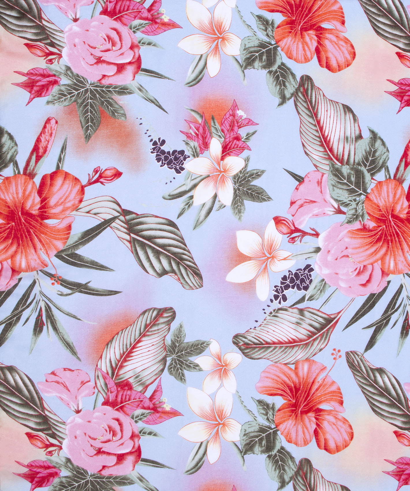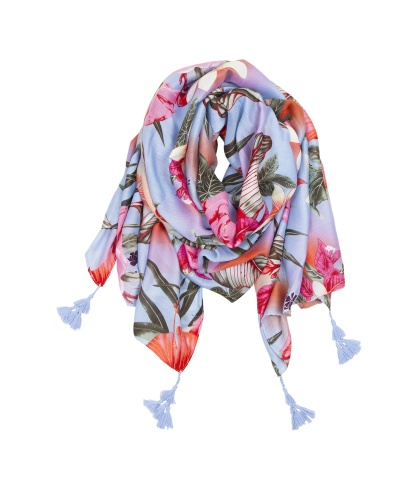 Легкий шарф из приятной на ощупь ткани. Принт с тропическими цветами - один из трендов нового сезона. Сочетание нежного голубого и активного розово-оранжевого. Шарф декорирован кисточками. Данная модель отлично подойдет к весенне-осеннему гардеробу.