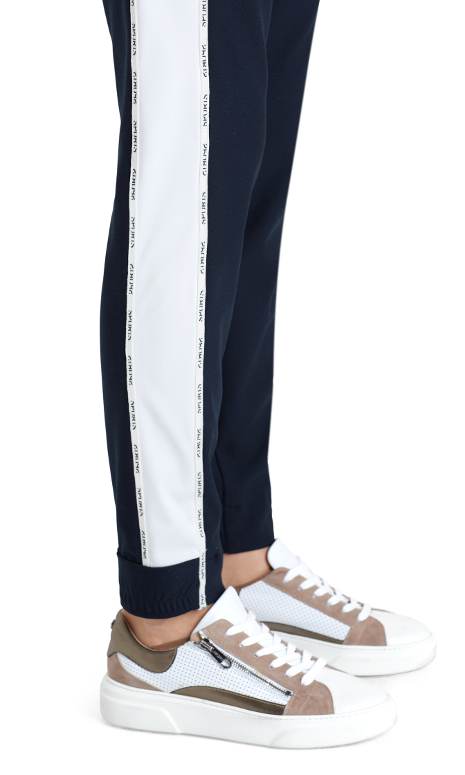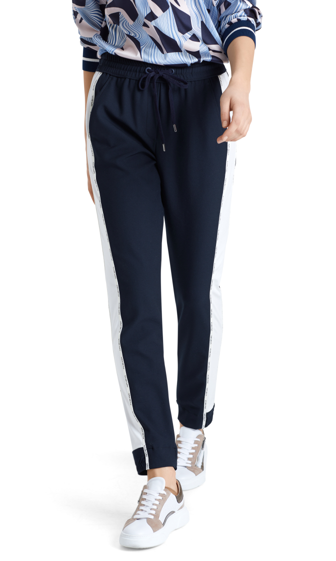Брюки в спортивном стиле. Средняя посадка, силуэт slim, эластичная лента и кулиска на талии, карманы спереди, декоративные вставки контрастного цвета по бокам. Эта модель - отличный выбор для тех, кто придерживается активного образа жизни!