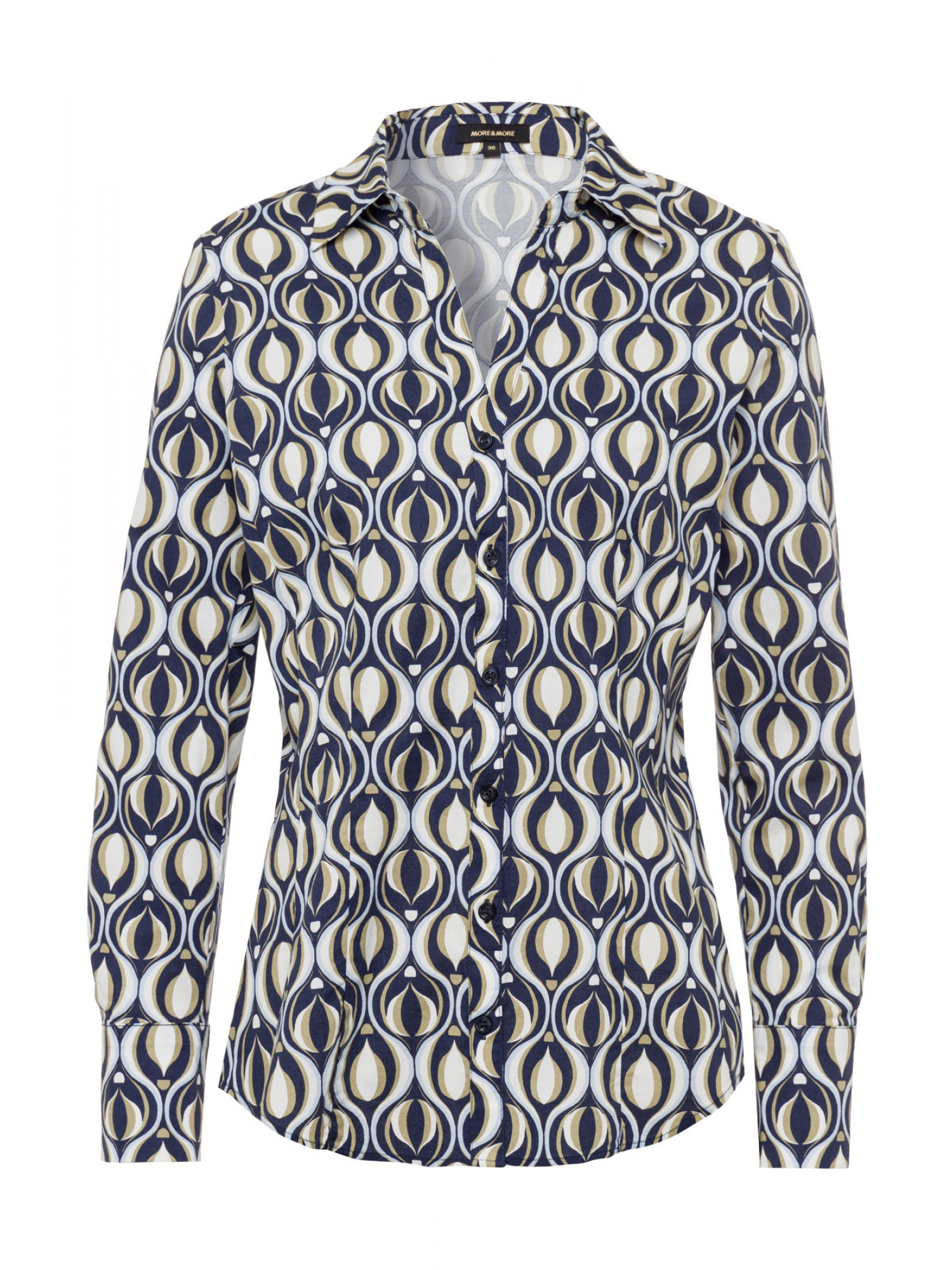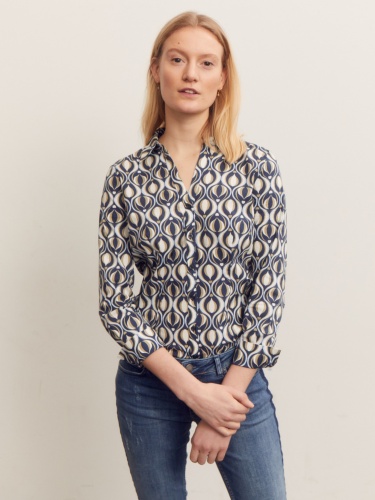 Классический крой рубашки интересно сочетается с современным принтом. Совместите стильную блузу с выцветшими джинсами, белыми брюками чинос или темно-синими деловыми брюками. - приталенный крой - планка с узкими пуговицами - манжеты на пуговицах - длина по размеру 42 = 66 см