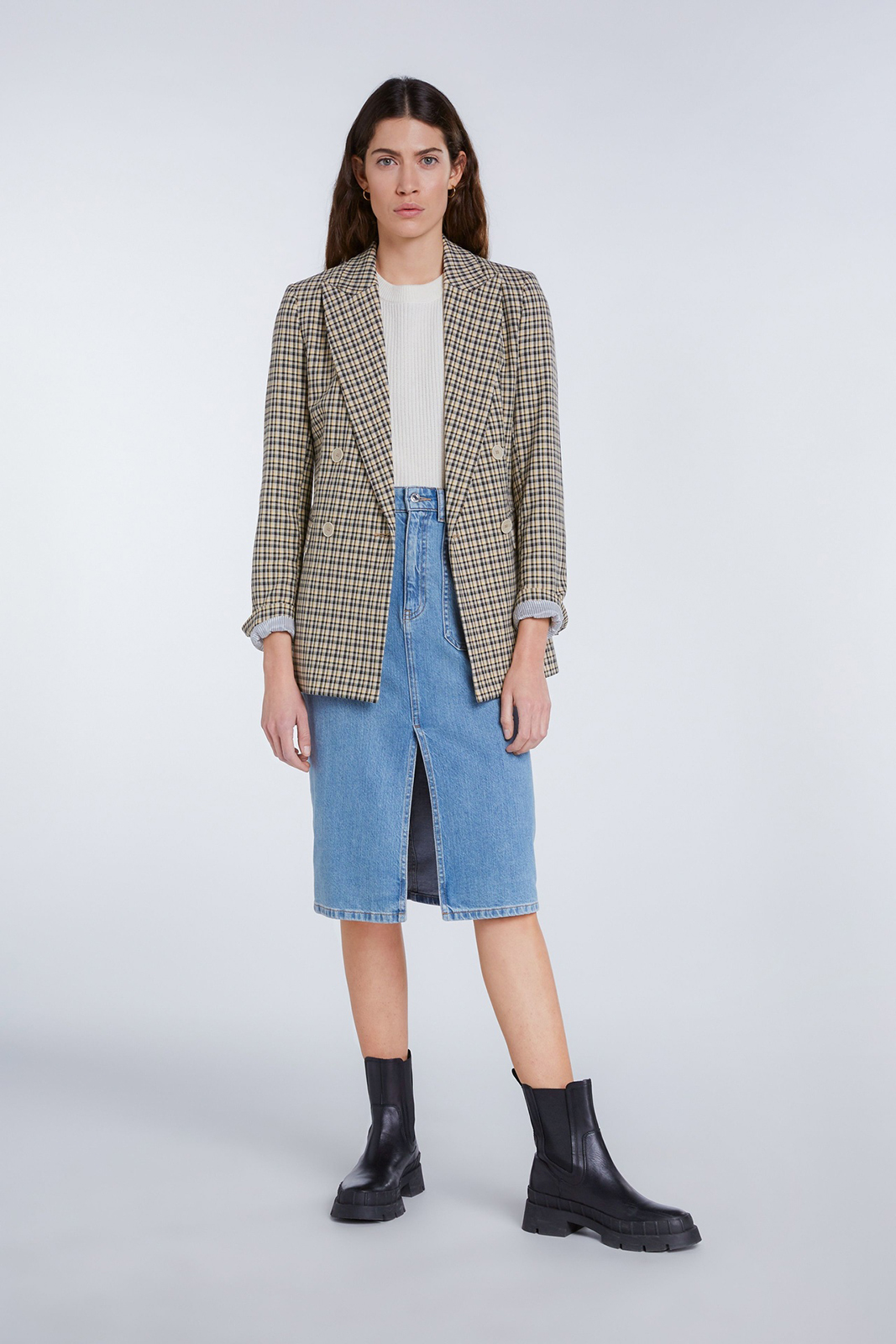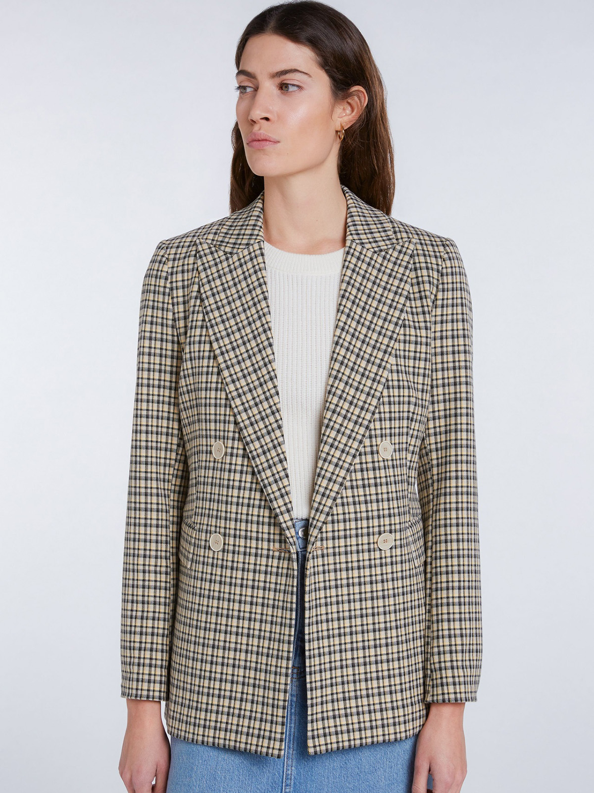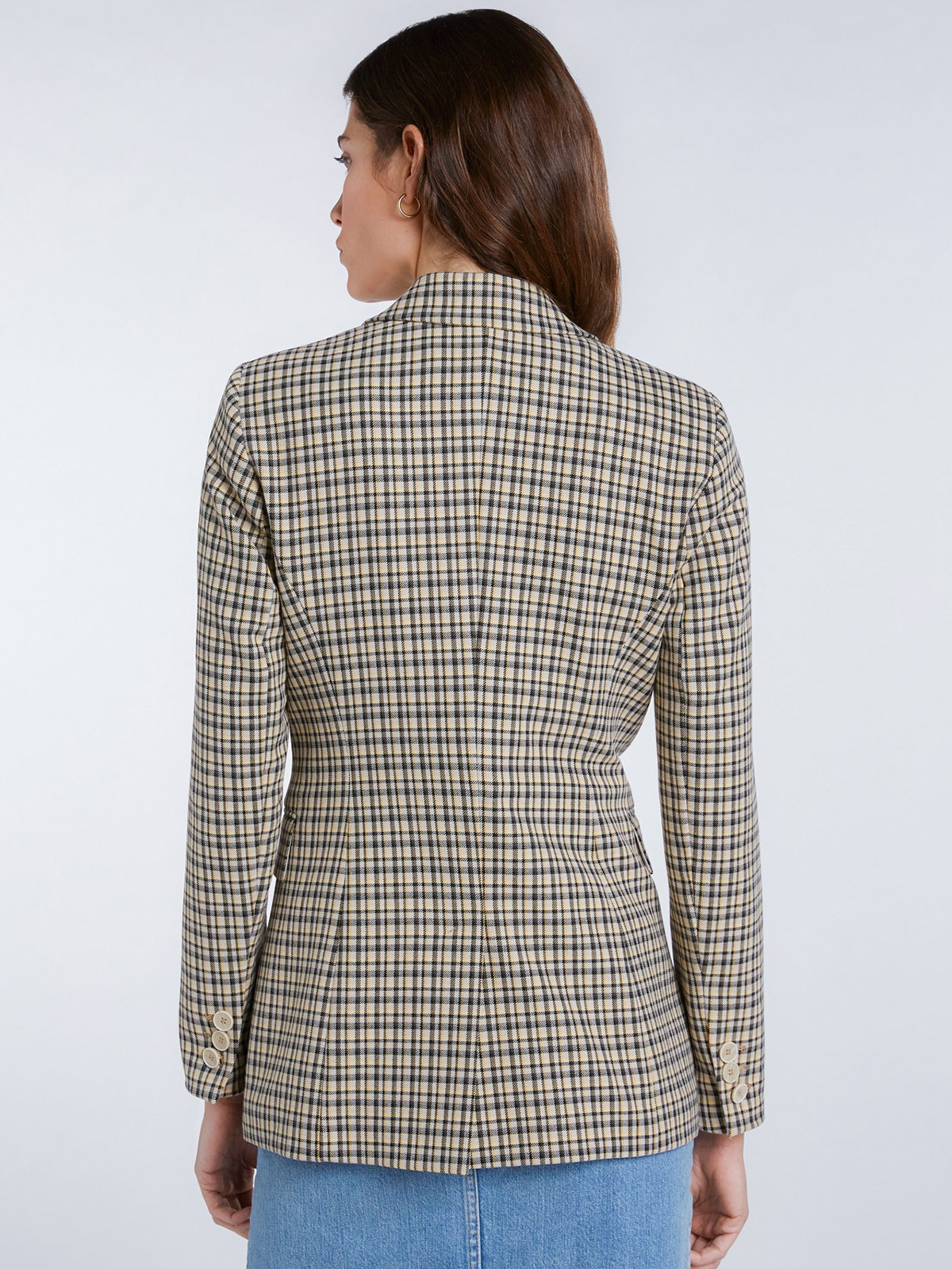 Клетчатый жакет прямого кроя. Отложной воротник с лацканами, застежка на пуговицы. Втачной рукав полной длины. Боковые карманы с клапаном.