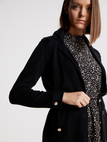 Черный жакет приталенного силуэта. Накладные карманы с клапаном. Втачной рукав полной длины с манжетами. Английский воротник.
