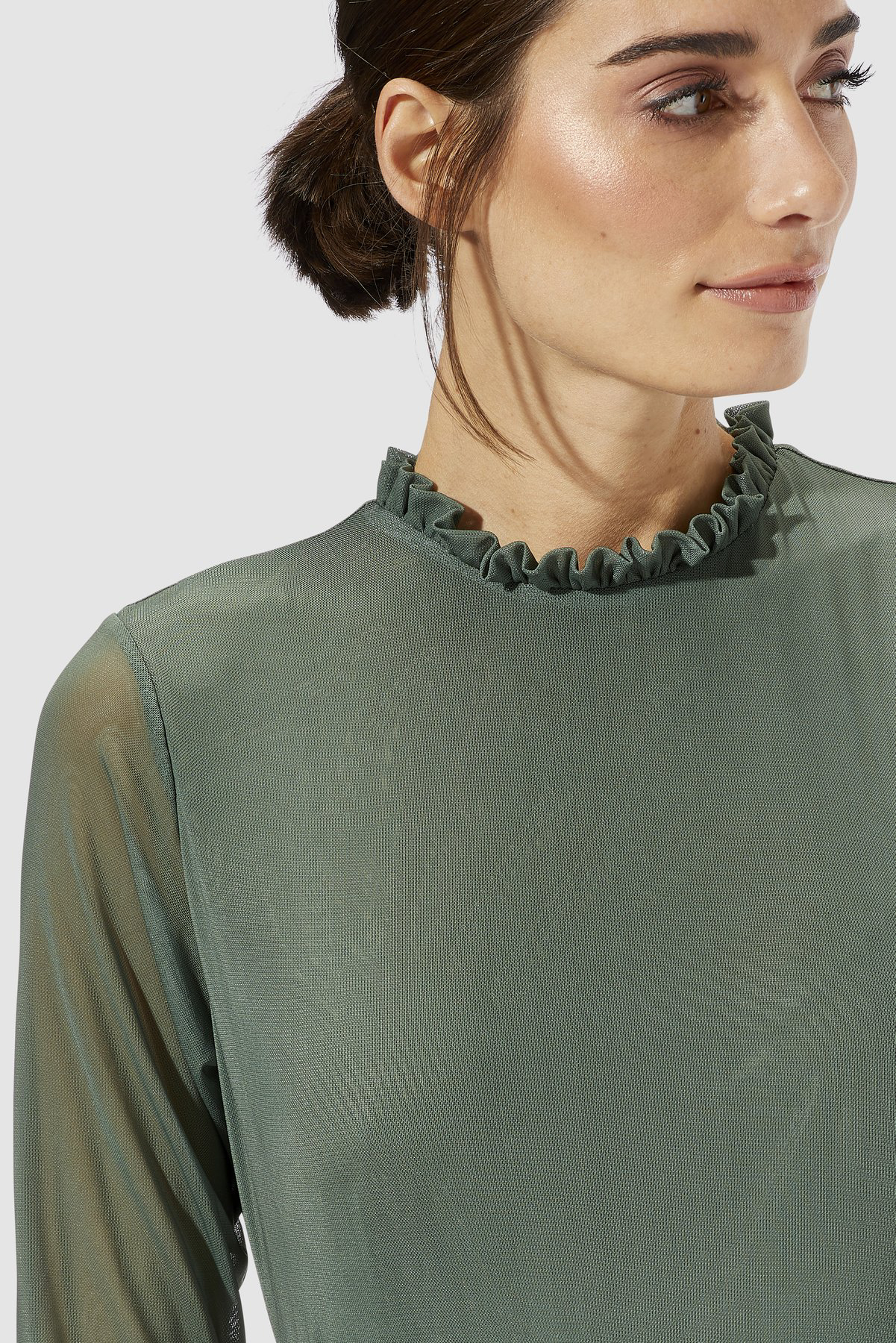 Однотонное платье миди в ретро стиле непринужденно подчеркнет женственность. Воротник-стойка украшен рюшами. Втачной рукав полной длины из полупрозрачного тюля. Волан по краю подола. Сзади вырез-капелька на пуговице.