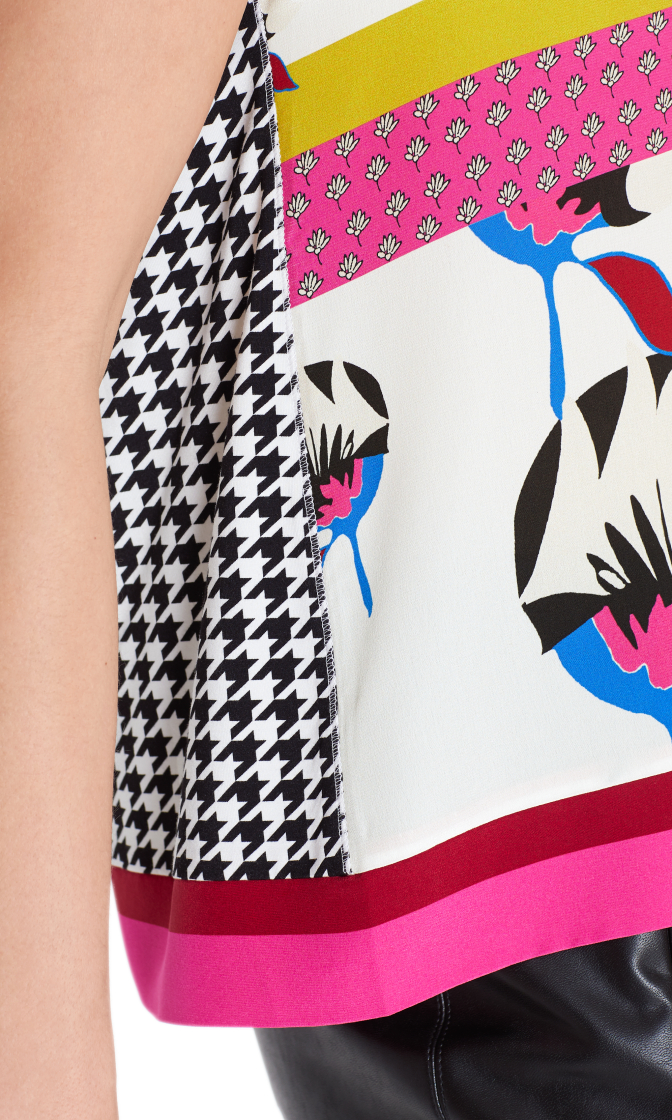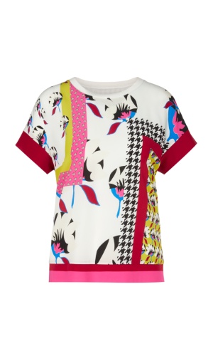 Блуза с ярким принтом станет главным акцентом в любом образе. Прямой покрой, круглый вырез горловины, короткие рукава. Приятный к телу материал из шелка и вискозы.
