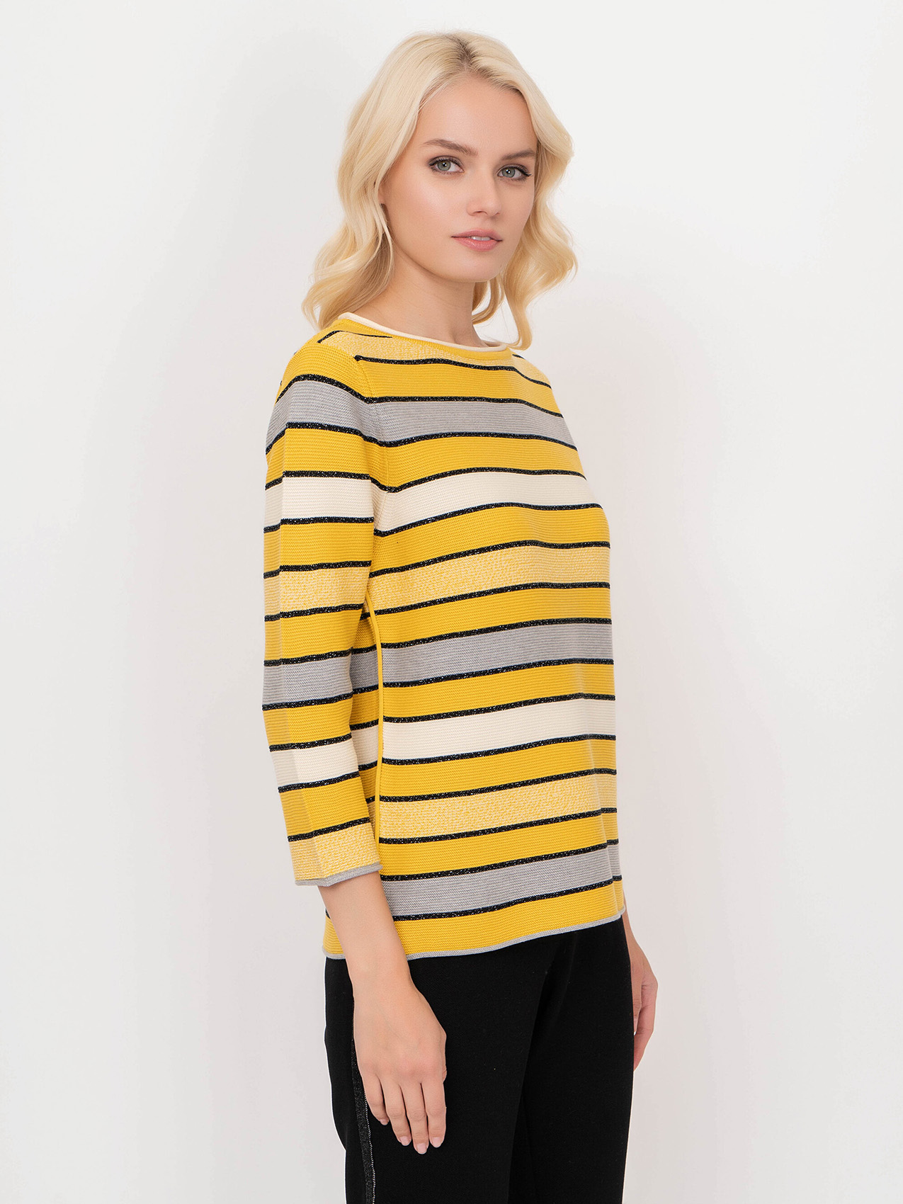 Яркий джемпер обеспечивает отличное настроение в холодное время года. Слегка приталенный силуэт, круглый вырез горловины, втачные рукава 3/4. Полосатый дизайн уверенно держится в тренде, а вплетение нити люрекса придает образу нотку шика. Материал из хлопковой смеси приятен к телу и удобен в ношении.