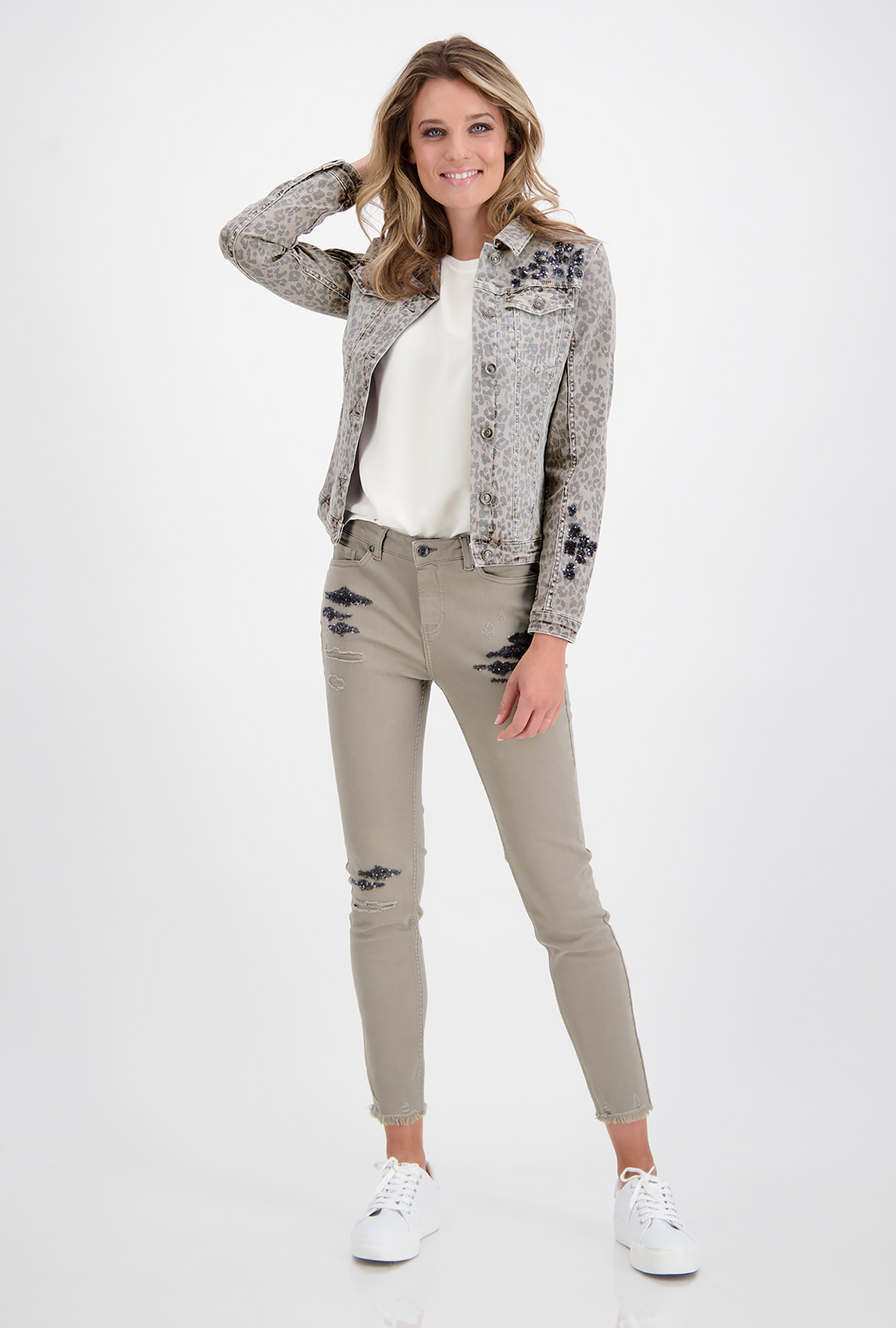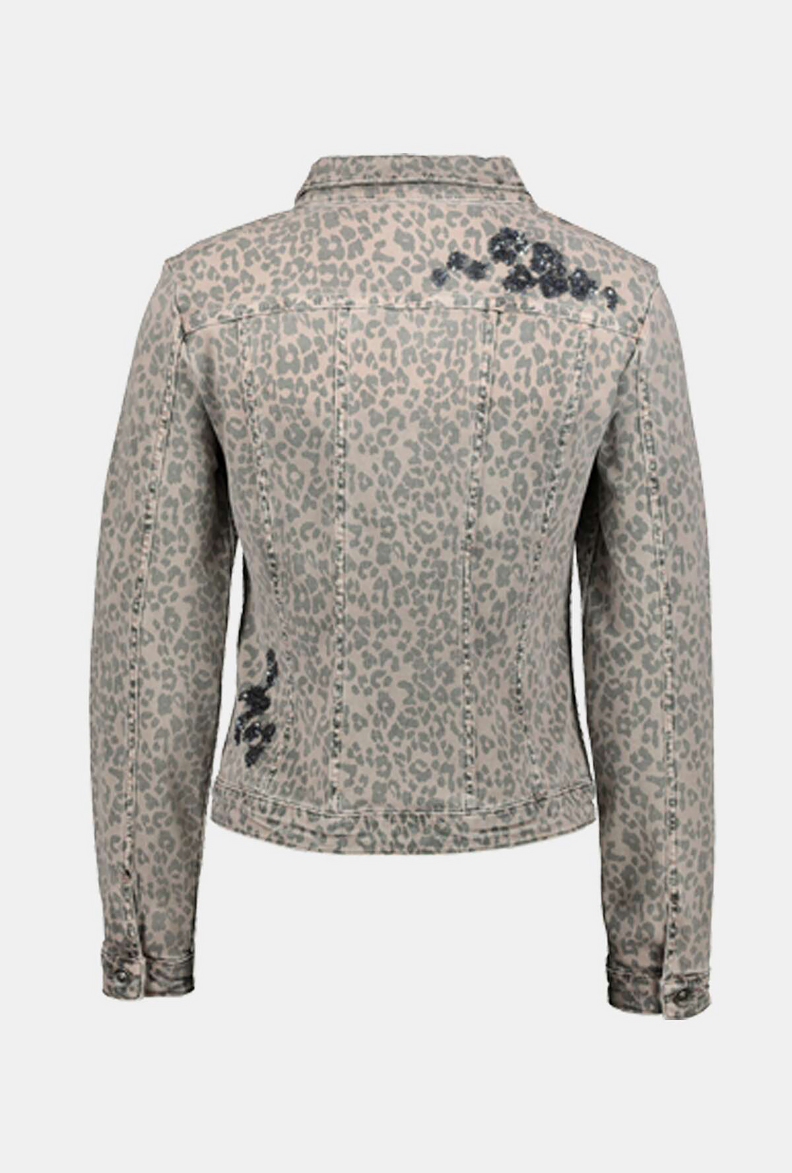Оригинальная джинсовка с накладными карманами и анималистичным принтом. Эффект запыленности делает джинсовку трендовой. Пайетки создают яркие акценты. Джинсовка застегивается на пуговицы, имеет втачной рукав полной длины.