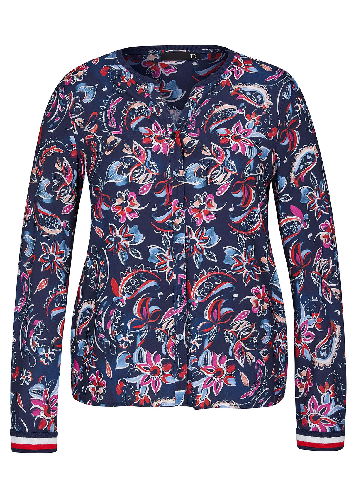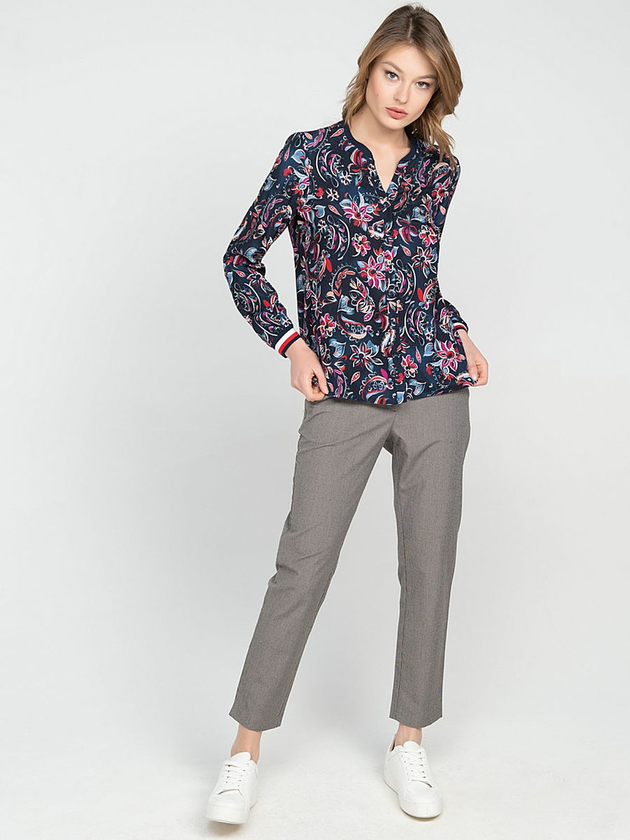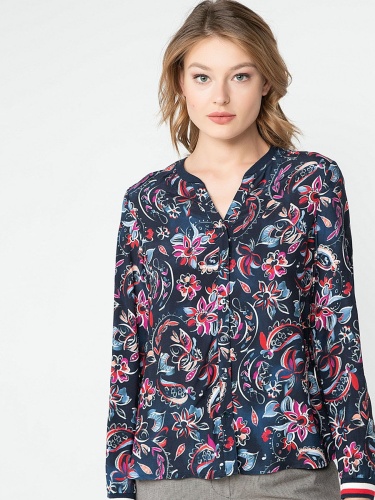 Блузка с контрастным цветочным принтом - стильный акцент в вашем образе! Вискозный материал приятен к телу, а прямой покрой обеспечивает максимальный комфорт. Завершенность дизайну придают круглый вырез, пуговичная планка и трикотажные манжеты на рукавах. Современная женственная модель отлично смотрится как с брюками, так и с юбкой.