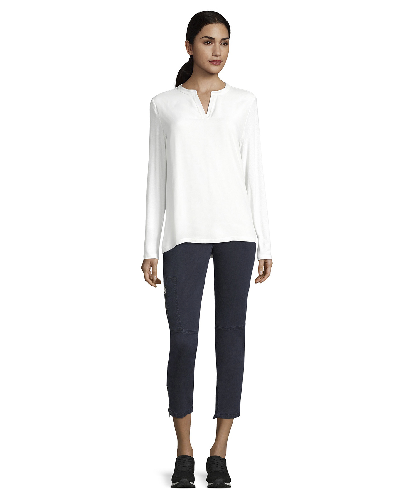 Белая блуза - необходимый элемент базового гардероба. Прямой покрой, V-образный вырез горловины, длинные рукава. Материал из вискозной смеси приятен к телу и обеспечивает комфорт. Эта простая элегантная модель является отличным компаньоном как для брюк, так и для юбки.