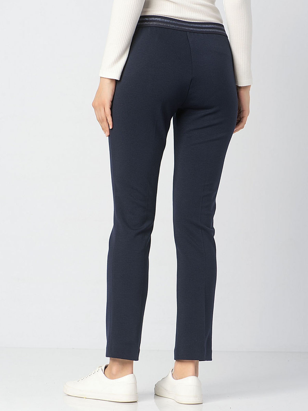Темно-синие брюки без карманов. Смесь из вискозы и синтетических материалов приятна к телу и обеспечивает идеальную посадку. Силуэт slim подчеркивает линию ног. Брюки простого, сдержанного дизайна предполагают бесчисленные варианты комбинаций.