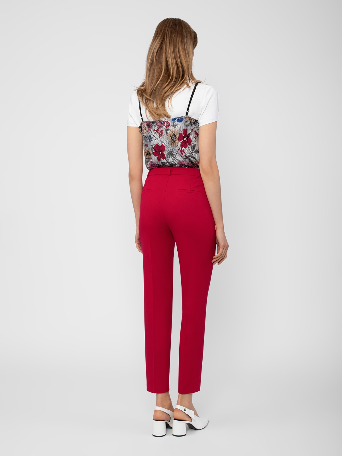Зауженные книзу брюки на притачном поясе со стрелками и боковыми карманами. Застежка спереди на молнию. Сзади карманы листочки.