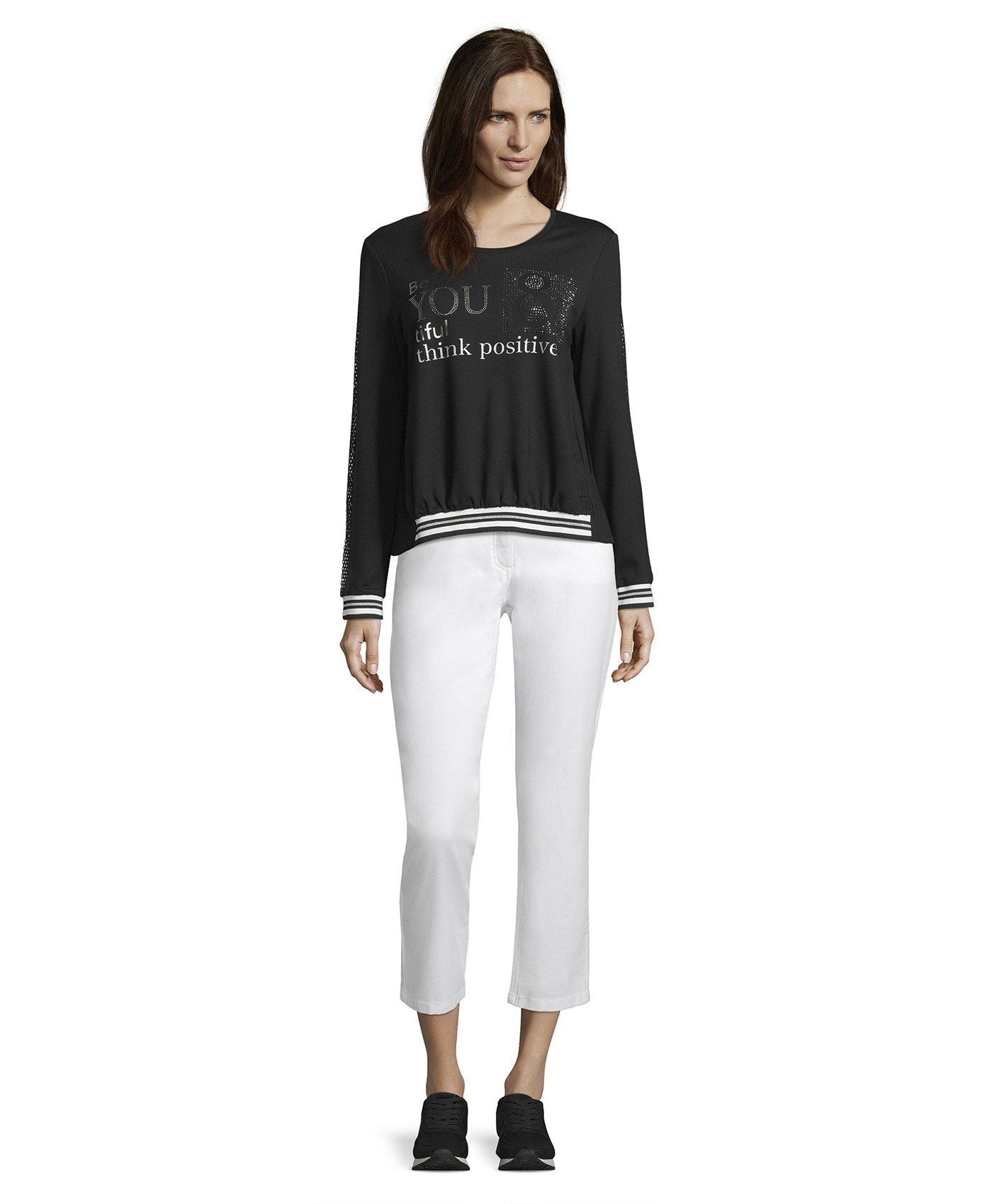 Джемпер прямого покроя. Круглый вырез горловины, удлиненная спинка, длинные рукава на манжетах. Материал из вискозной смеси обеспечивает комфорт. Блестящая отделка вдоль рукавов и декор стразами придают образу гламур. Отличный вариант верха для стильного повседневного образа!