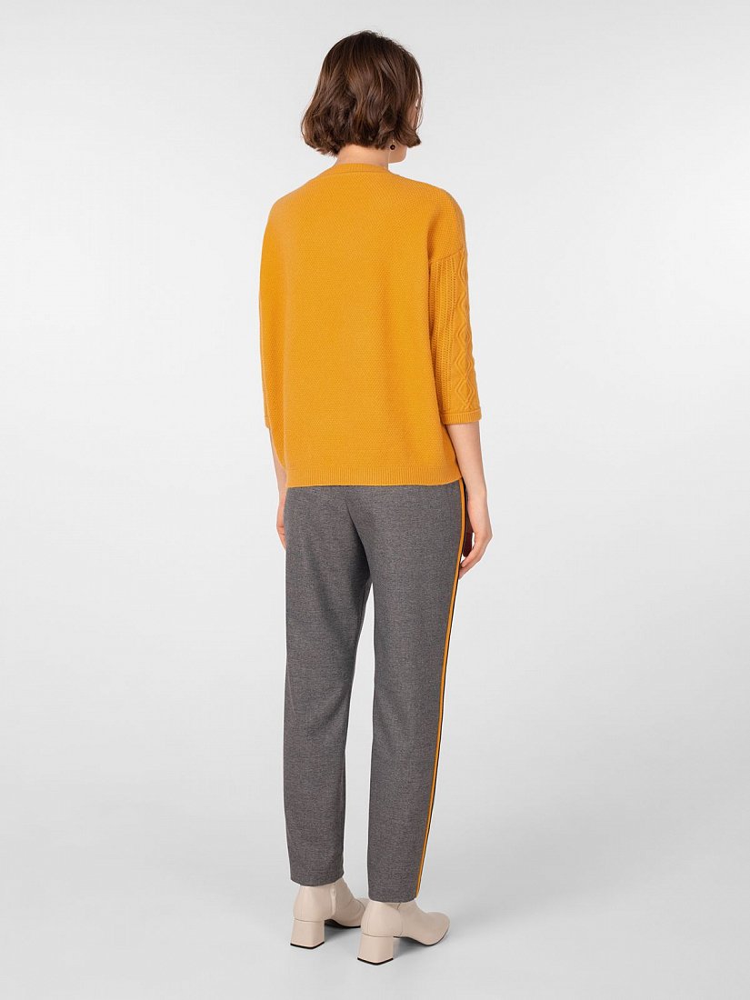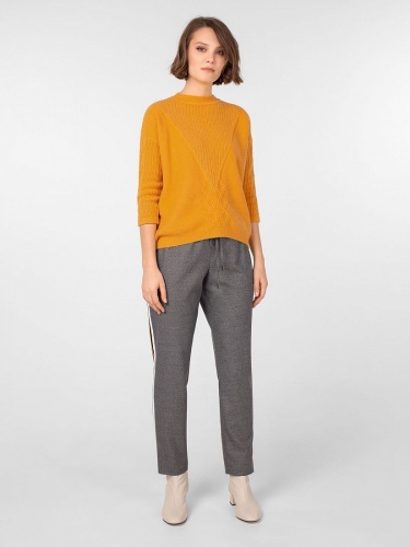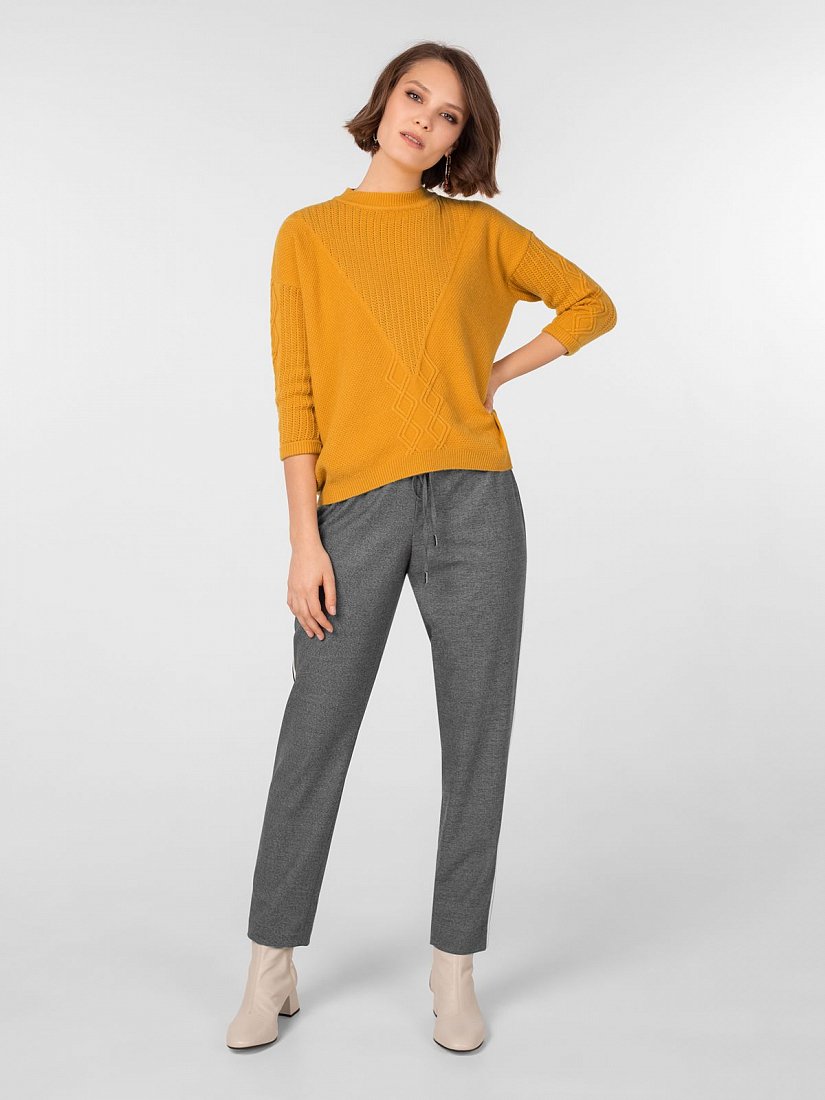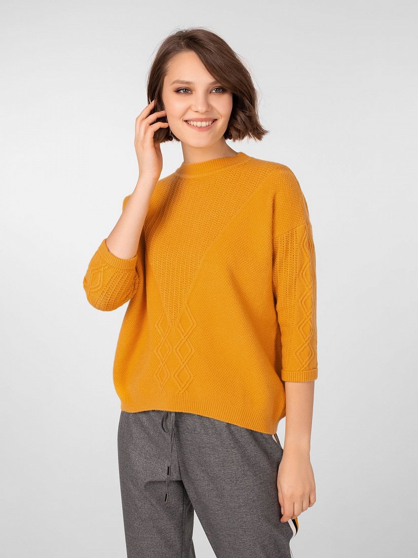Джемпер из фактурного вязанного трикотажа прямого силуэта с круглой горловиной, спущенным плечом и рукавом полной длины. Спереди объемный геометрический рисунок.