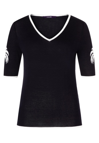 Приталенный джемпер. V-образный вырез горловины, рукава 1/2. Белая отделка горловины, рукавов и низа изделия, рисунок на рукавах. Приятный к телу материал из смеси вискозы и хлопка обеспечивает комфорт.