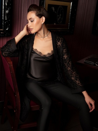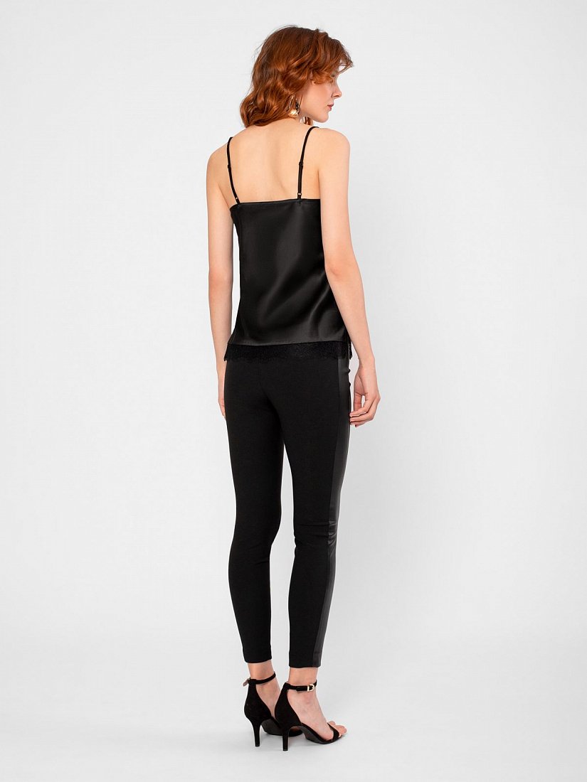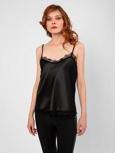 Топ прямого силуэта на бретелях с v-образным вырезом горловины. Бретели, вырез и низ изделия декорированы кружевом.
