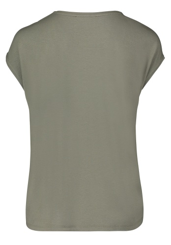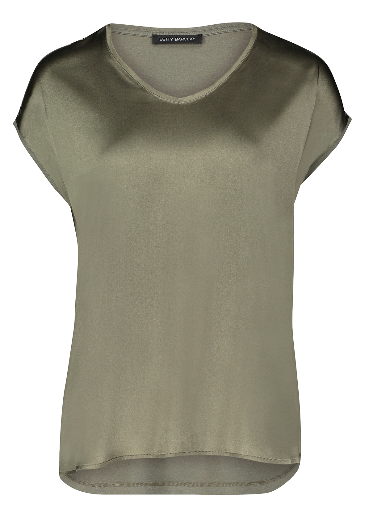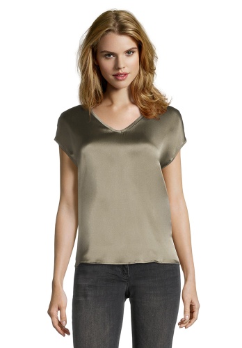 Базовая футболка свободного покроя будет уместна в любом гардеробе! V-образный вырез горловины, короткие цельнокроеные рукава. Приятный к телу материал из шелковой смеси. Шелковый блеск переда придает шик и элегантность всему образу.
