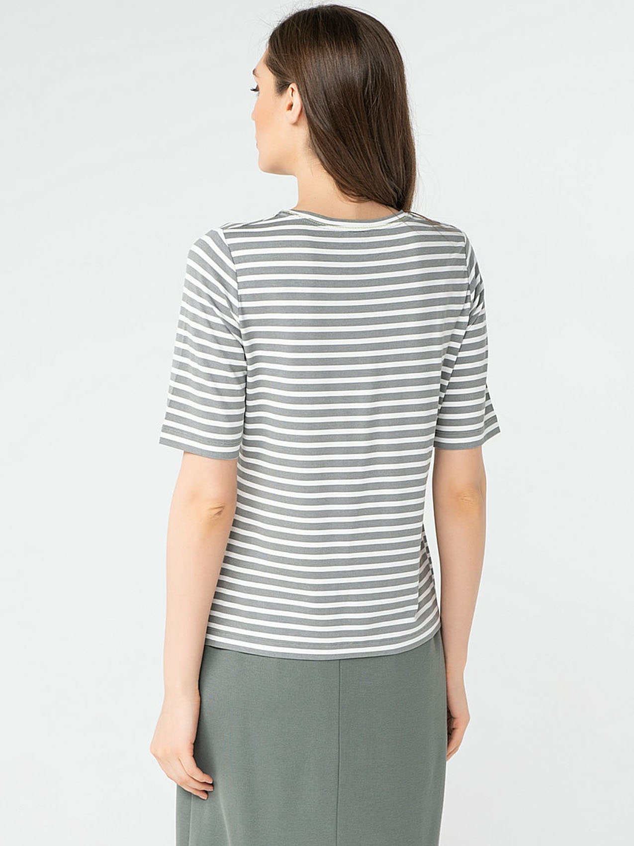 Полоска и тропические цветы - отличное сочетание трендовых мотивов! Приятный к телу материал из смеси вискозы и эластана гарантирует отличную посадку, а рукав 1/2 придает образу легкость и непринужденность. Футболка будет замечательным компаньоном как в брючном, так и в юбочном комплекте.