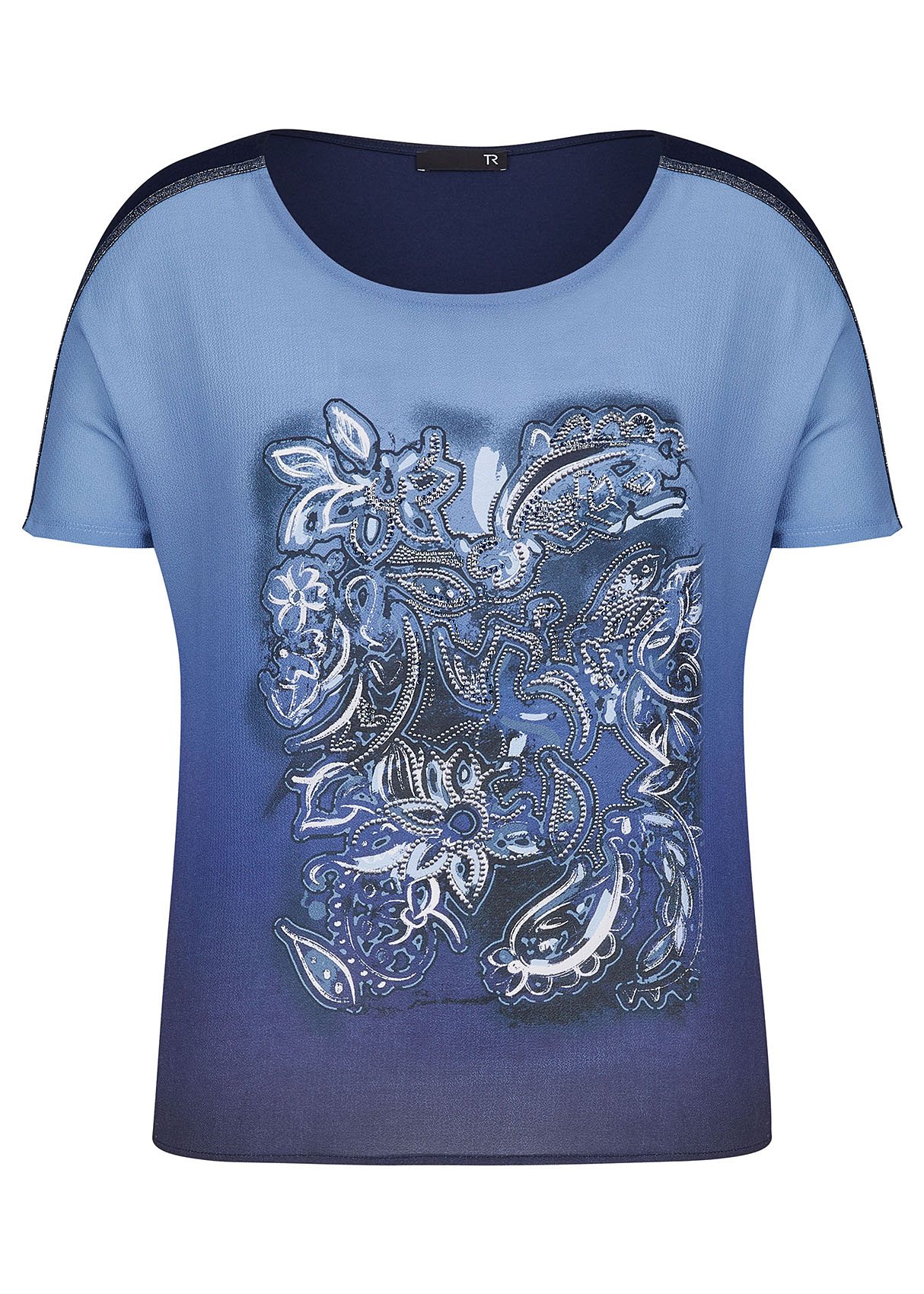 Великолепное сочетание трендов - нежный сине-голубой градиент и цветочный принт на переде футболки. Спинка футболки выполнена из однотонного темно-синего материала. Элегантный акцент - декоративная лента по линии плеча. Мягкий материал из смеси вискозы и эластана гарантирует отличную посадку, а короткий цельнокроеный рукав придает образу легкость и непринужденность. Футболка будет замечательным компаньоном как в брючном, так и в юбочном комплекте.