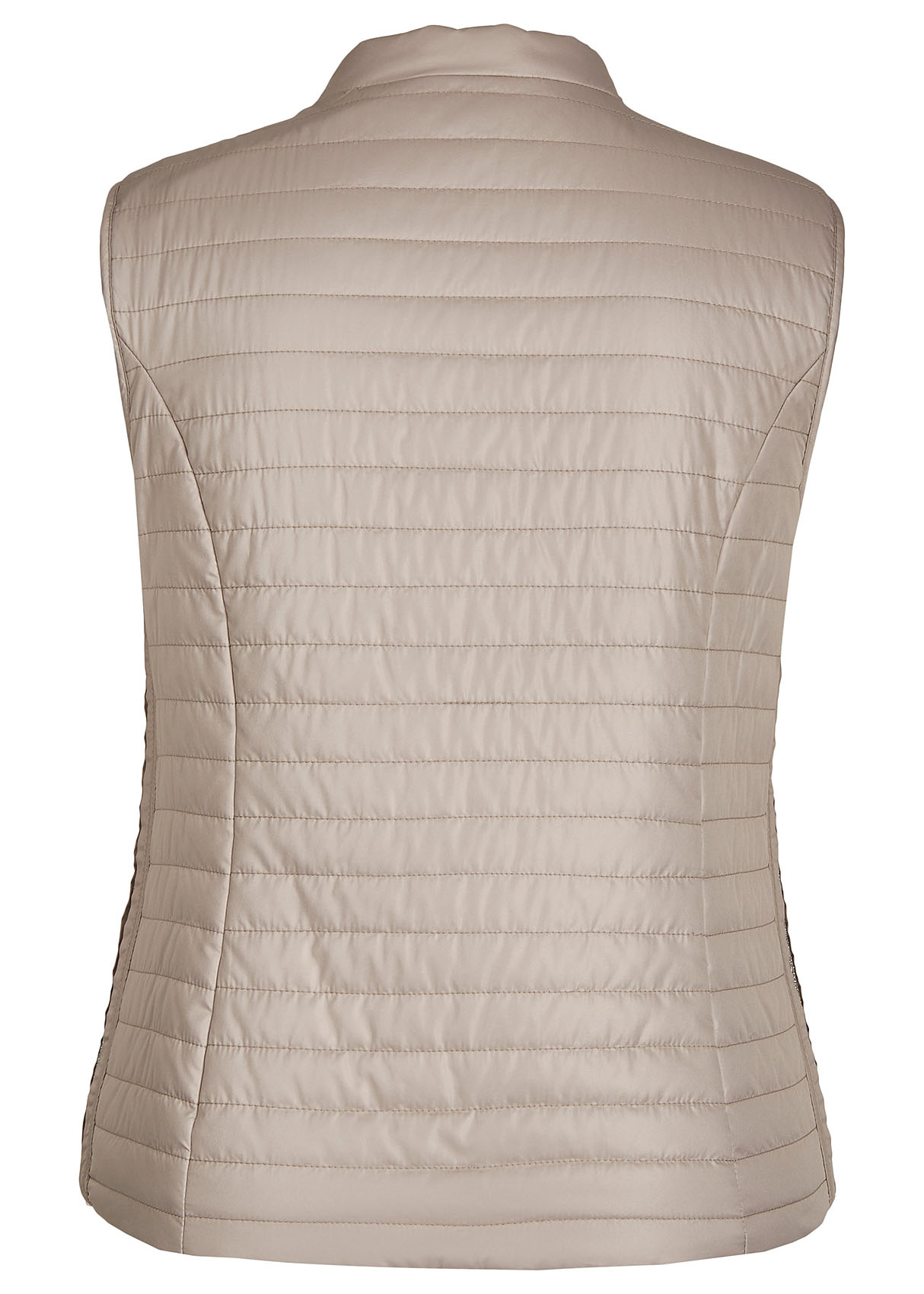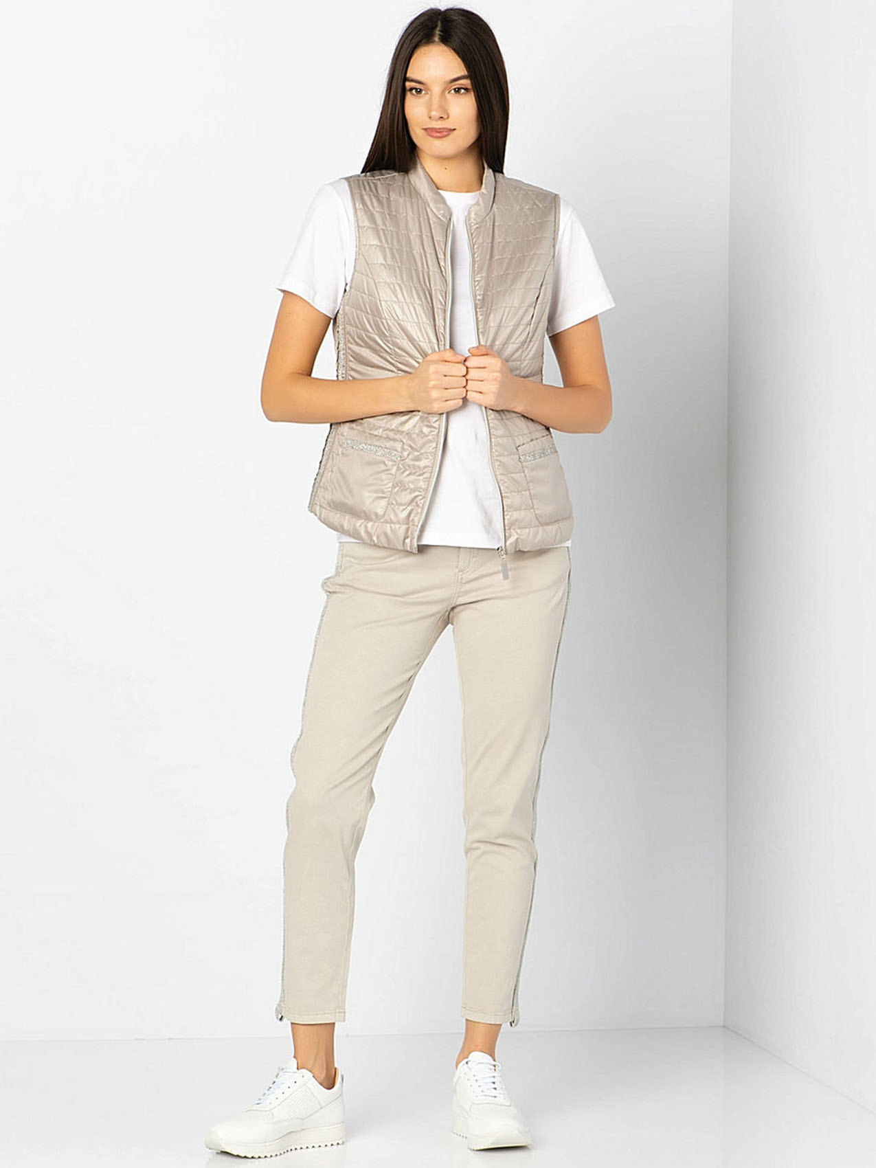 Великолепный стеганый жилет из легких синтетических волокон. Небольшой воротник-стоечка. Замок по всей длине и карманы спереди обеспечивают удобство. Завершает дизайн декоративная лента на карманах.
