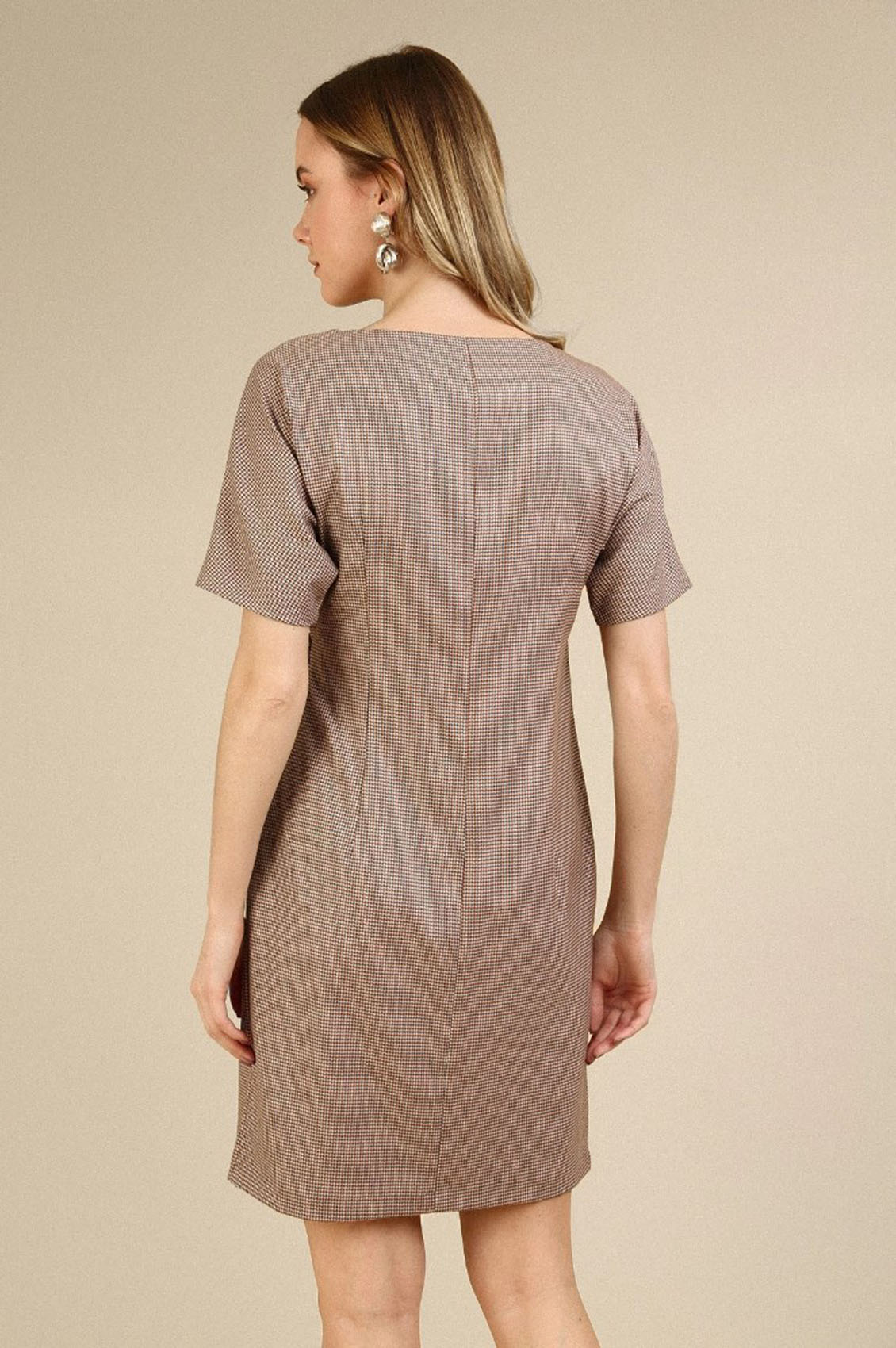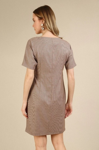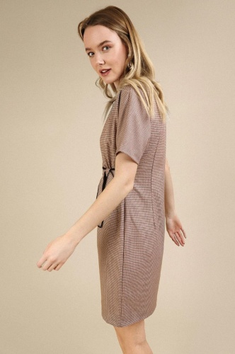 Платье с орнаментом "гусиная лапка" в коричнево-серой цветовой гамме. Модель без подкладки, имеет полуприталенный силуэт, круглый вырез горловины, короткие цельнокроеные рукава, вертикальные вытачки на спине. Украшением служит асимметрично расположенный притачной декоративный элемент в форме банта с контрастной черной окантовкой, формирующий мягкие складки в районе линии талии.