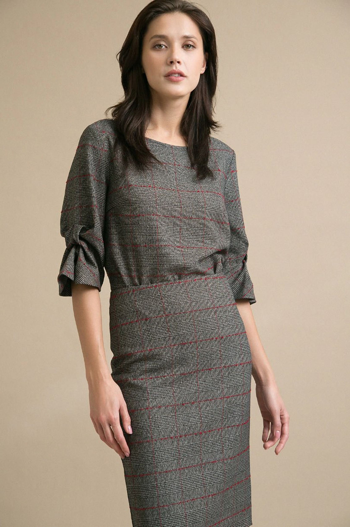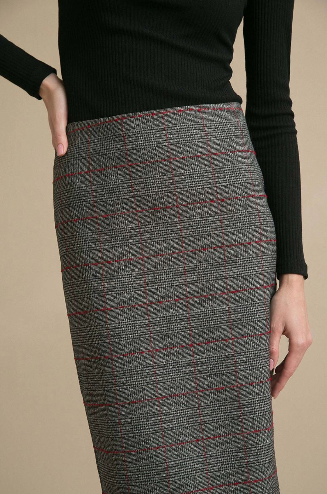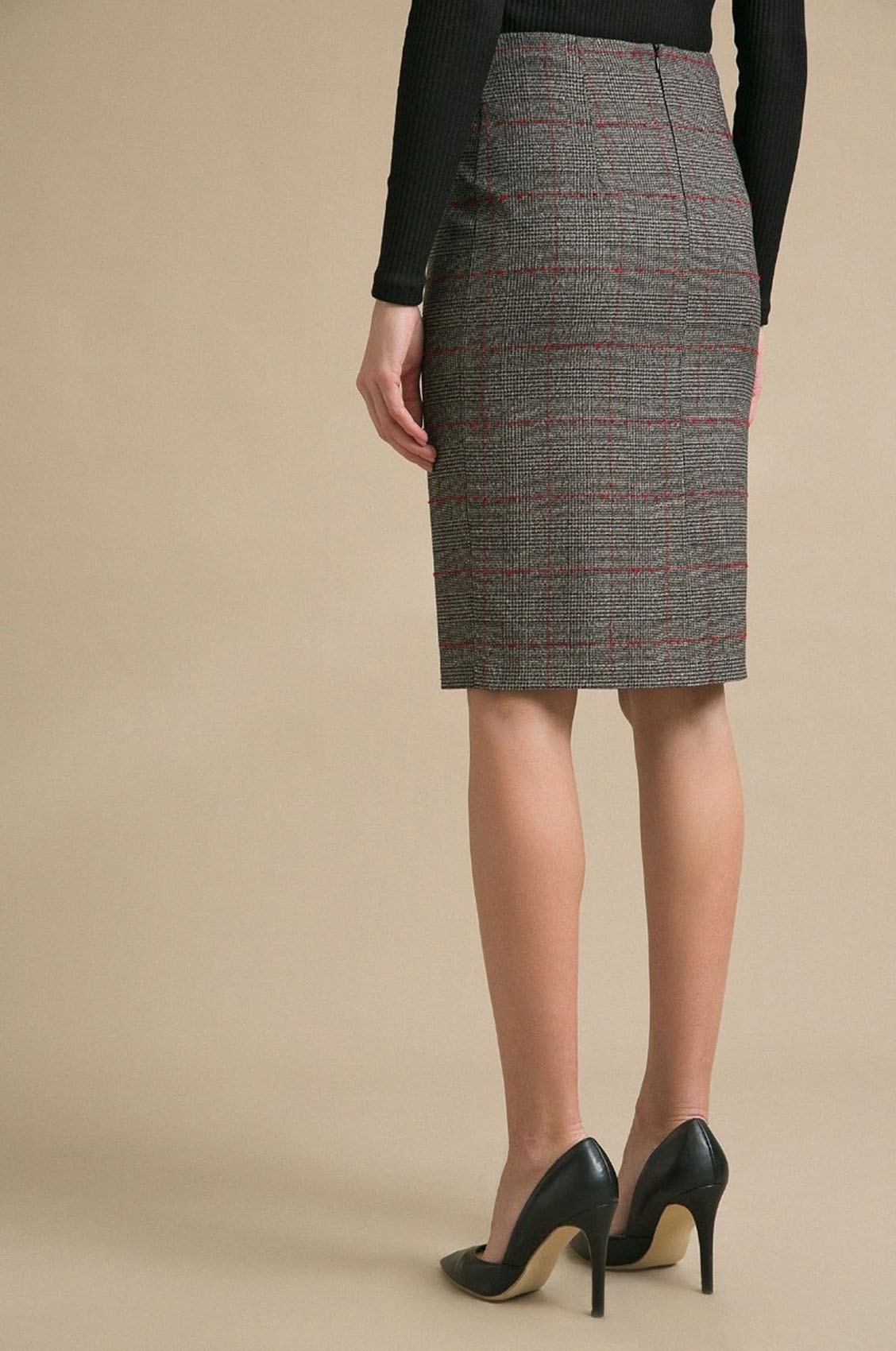 Серая юбка в клетку. Модель прямого кроя, выполнена без пояса, застегивается сзади на молнию в серединном шве. Лаконичная, простая модель в духе минимализма. Подойдет для повседневной жизни и деловых встреч.