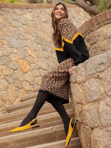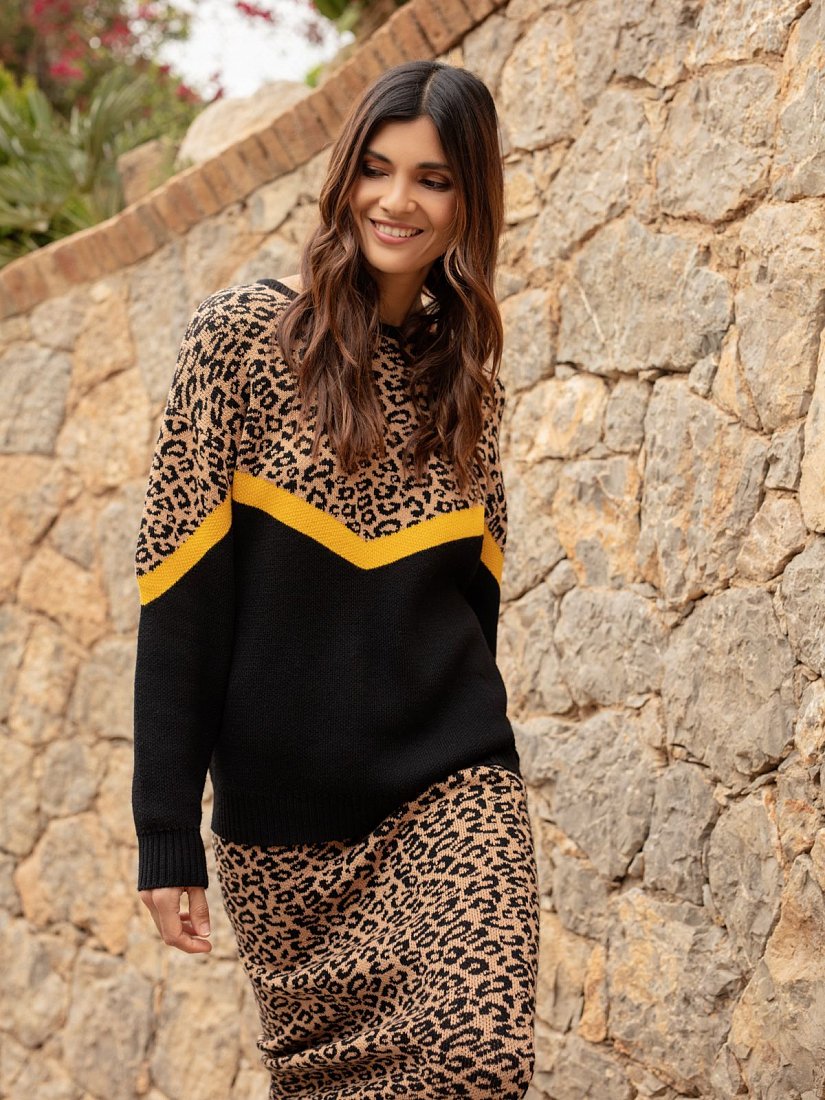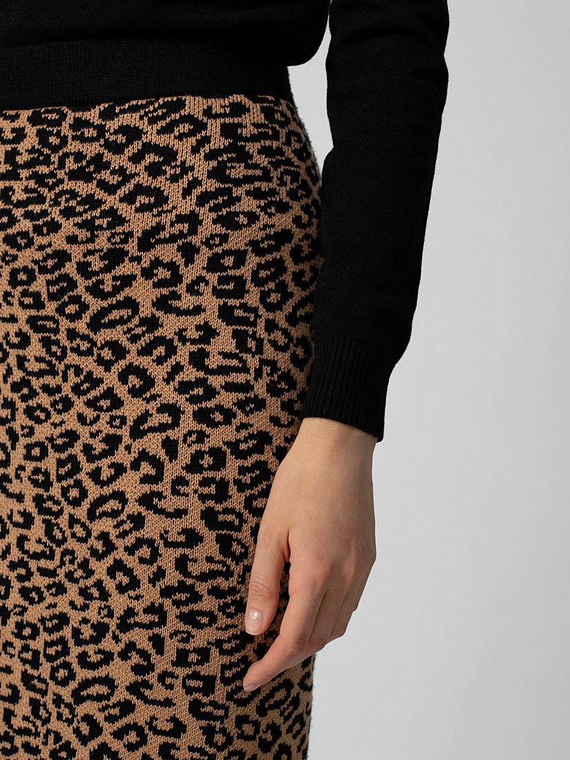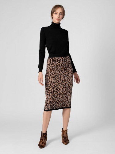 Юбка прямого силуэта на поясе из вязанного трикотажного жаккарда с леопардовым рисунком. Без застежки.