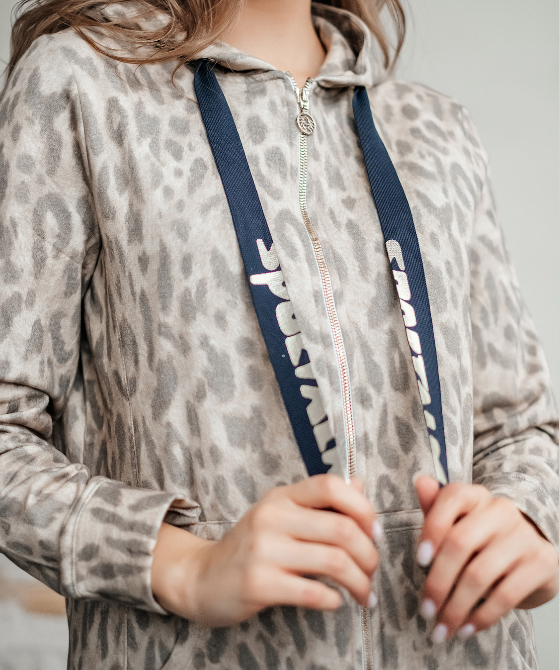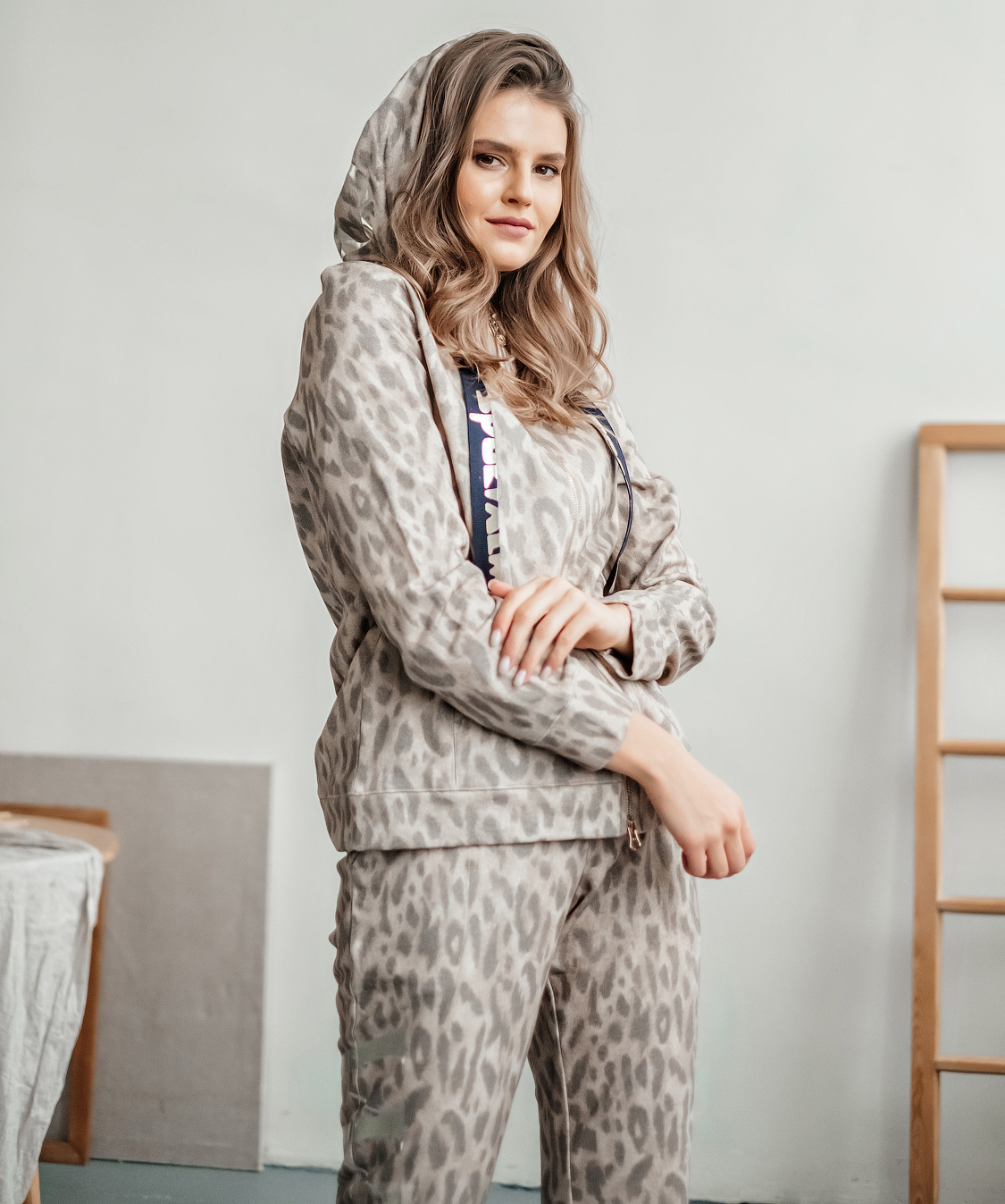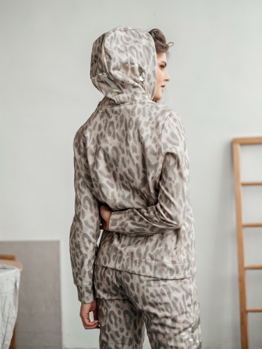 Леопардовая толстовка – трендовый и уютный вариант верха для броского образа. Глубокий капюшон на кулиске, шнурок с логотипом, вместительные карманы. Капюшон украшает надпись золотого цвета.