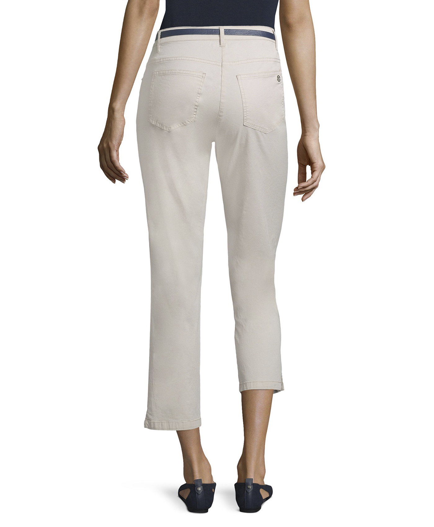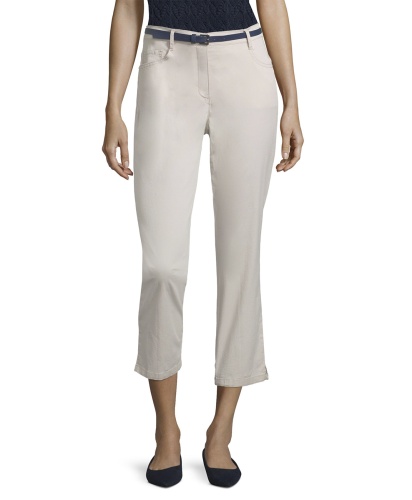 Укороченные брюки слегка расклешенного кроя обращают на себя внимание. Универсальная средняя посадка. Небольшие разрезы снизу по боковым швам. Приятный к телу материал из хлопковой смеси обеспечивает комфорт в ношении. В сочетании как с футболкой, так и с блузой эти брюки создают стильный современный образ.