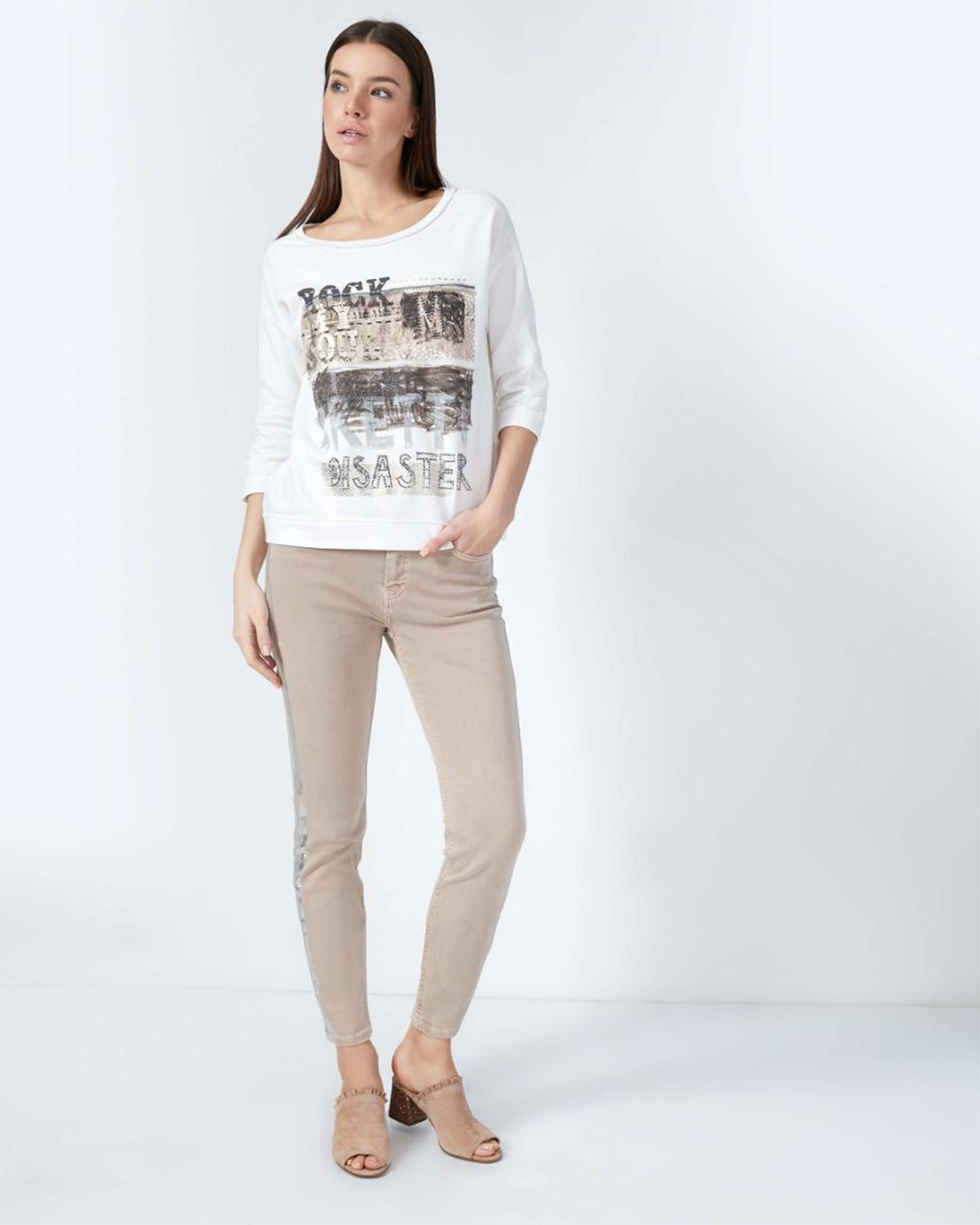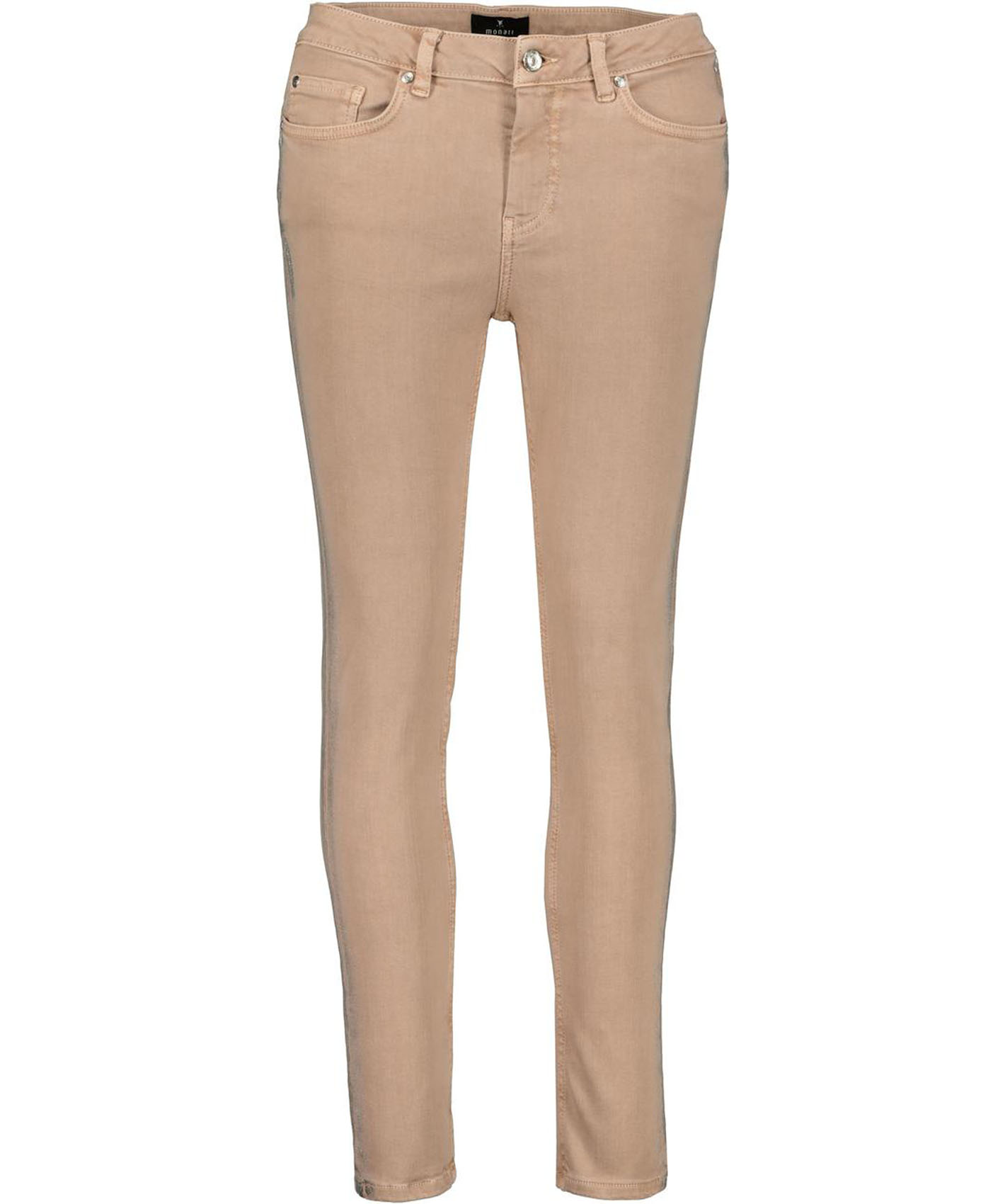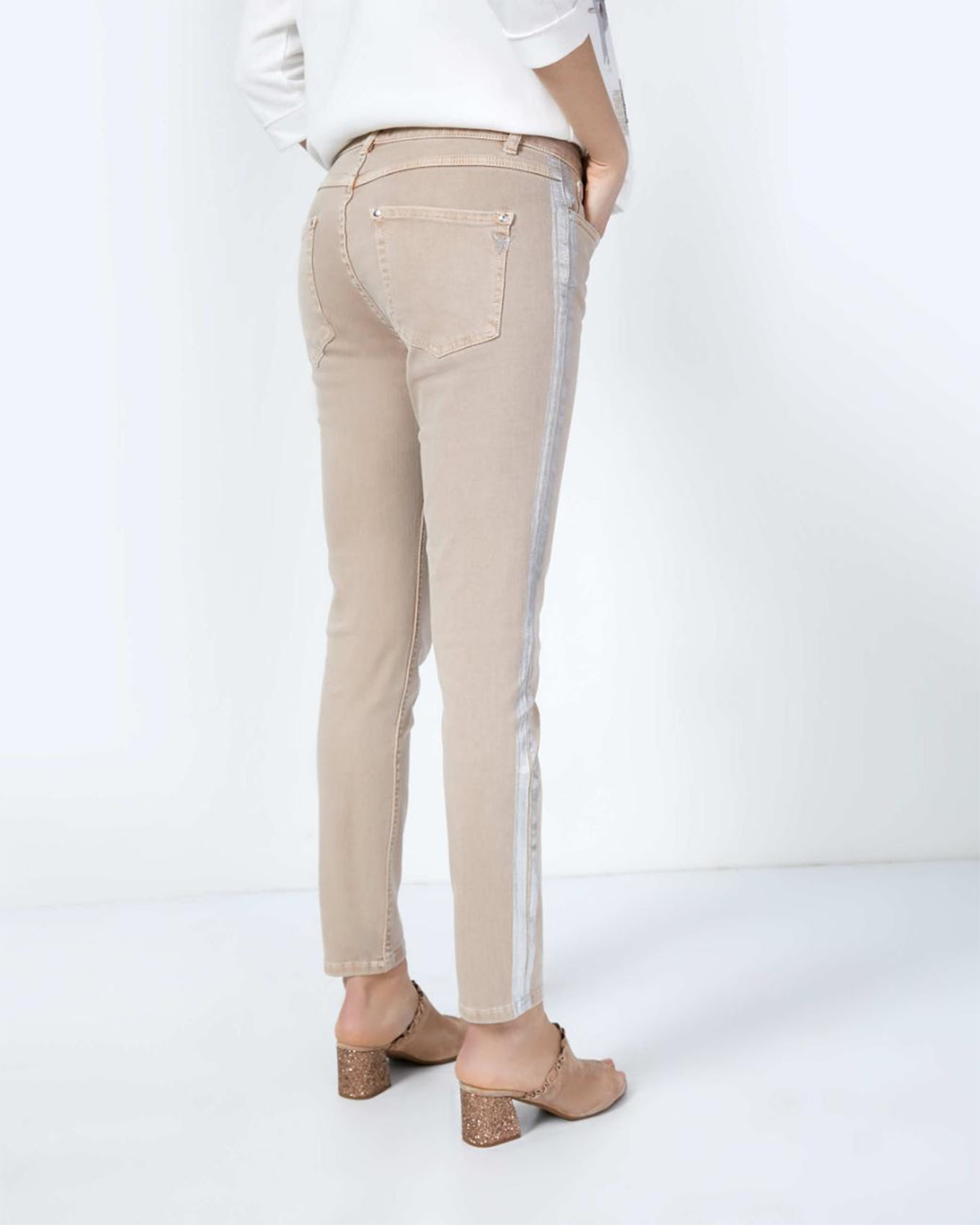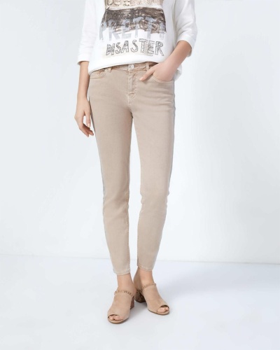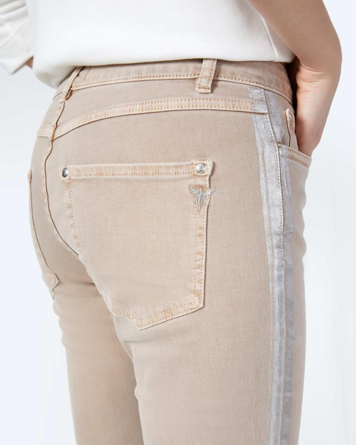 Джинсовые брюки песочного цвета. 5 карманов. Декоративные ленты по бокам создают более спортивный образ. Приятный к телу и практичный материал из смеси хлопка и эластана.