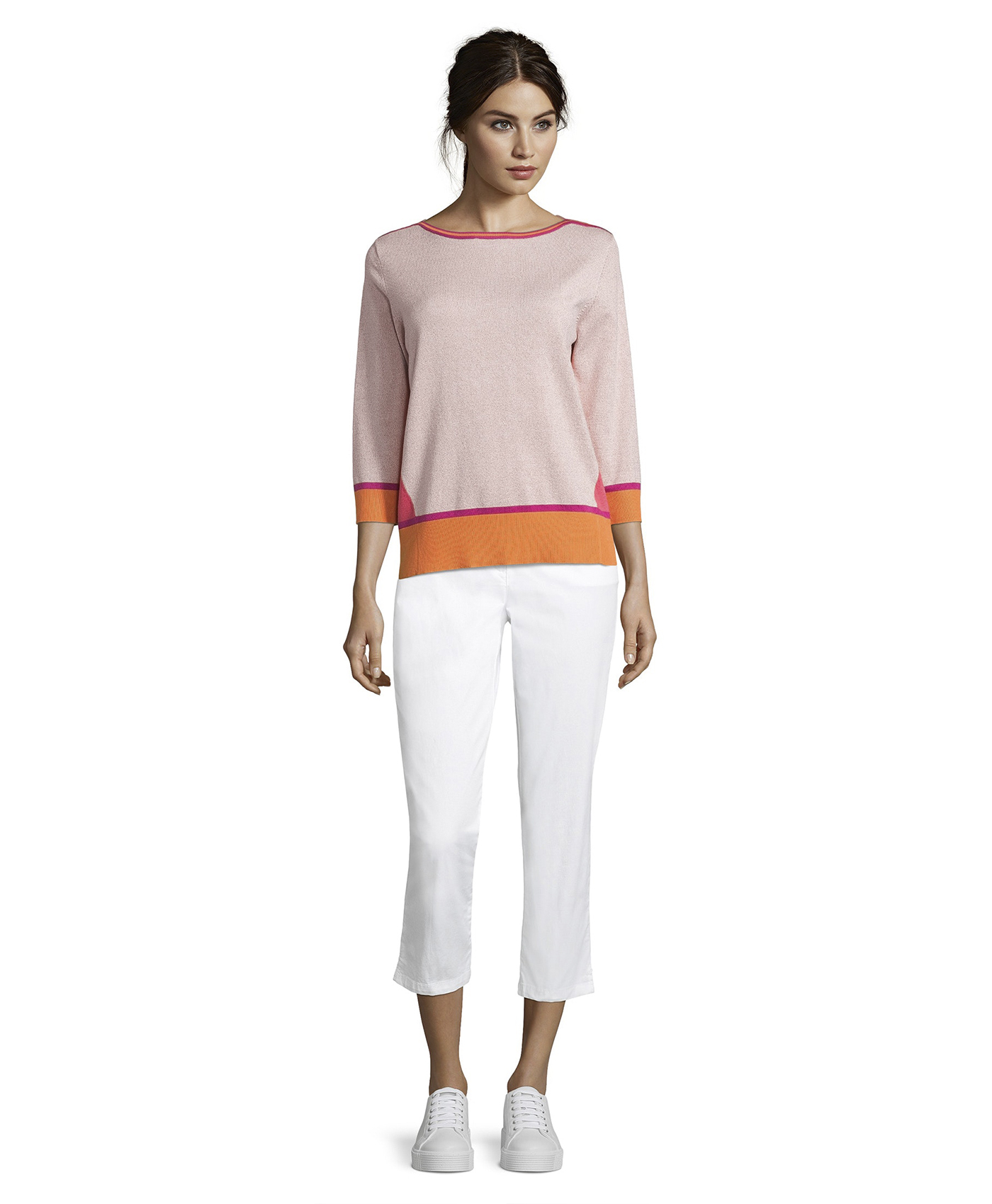 Новая вариация модного дизайна в стиле колор-блок! Прямой покрой, вырез горловины "лодочка", рукава 3/4. Материал из вискозной смеси приятен к телу и обеспечивает комфорт. Нить люрекса в составе материала придает изделию гламурный блеск. Этот джемпер гарантирует создание современного образа с любым однотонным вариантом низа и любой обувью.