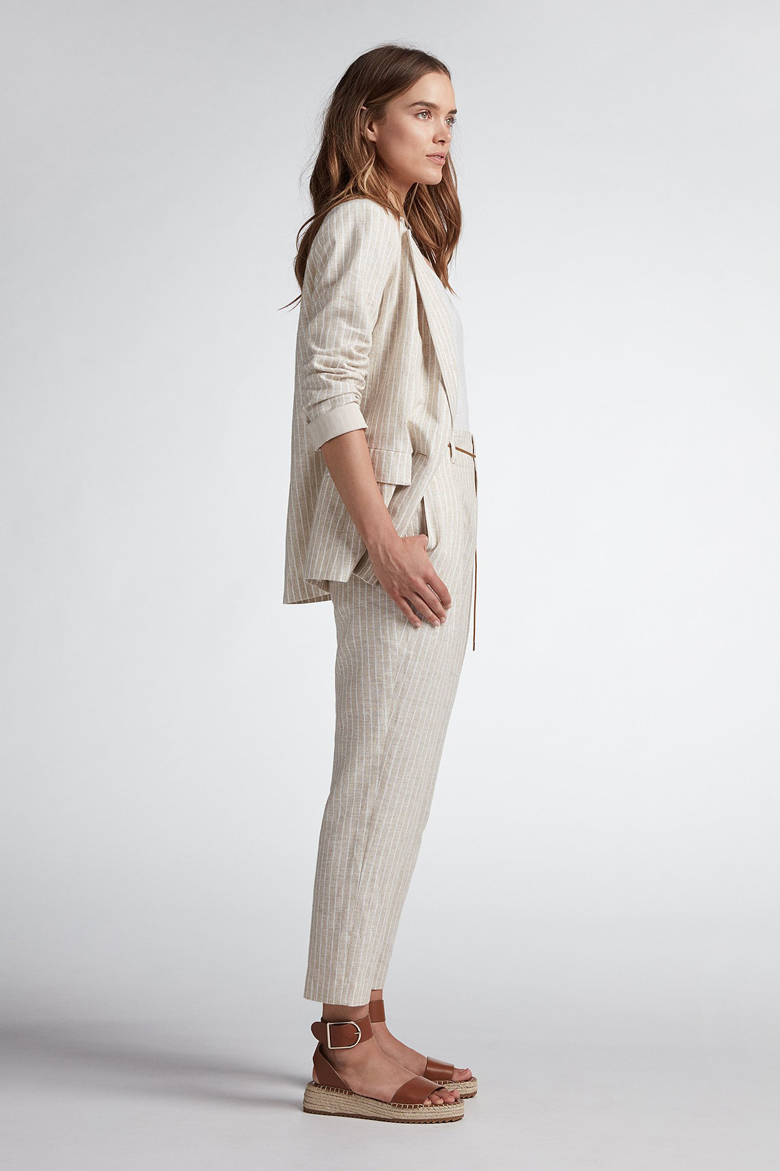 Жакет прямого покроя обязательно должен быть в каждом гардеробе! Отложной воротник с лацканами, застежка на пуговицах. Трендовый принт в полоску. Материал из смеси хлопка и льна приятен к телу и обеспечивает комфорт. Эта модель универсальна и может служить основой как для делового, так и для повседневного образа.