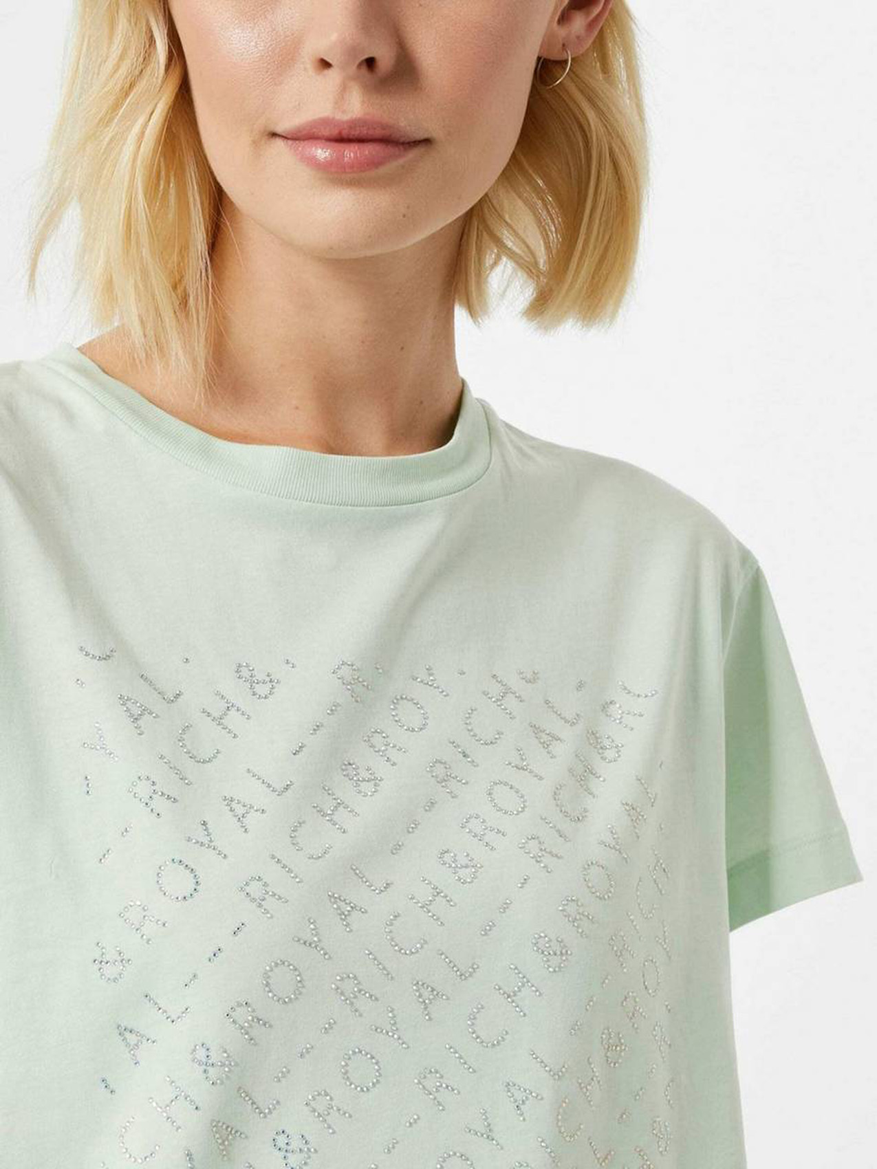 Эту футболку можно носить как с рваными джинсами, так и с классическим костюмом. Прямой покрой и хлопковый материал обеспечивают комфорт и создают непринужденный образ. Гламурные акценты - декор стразами на переде футболки.