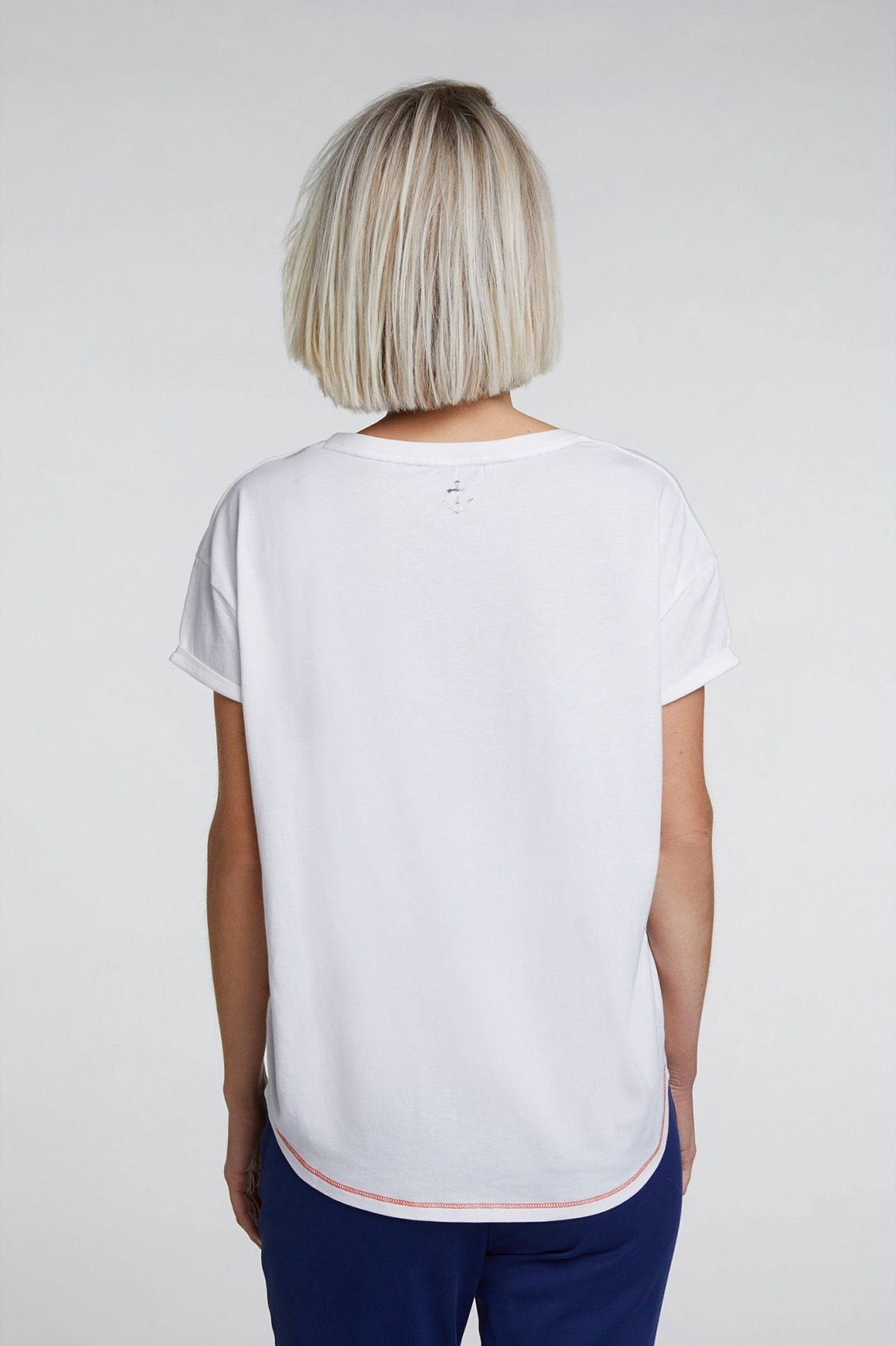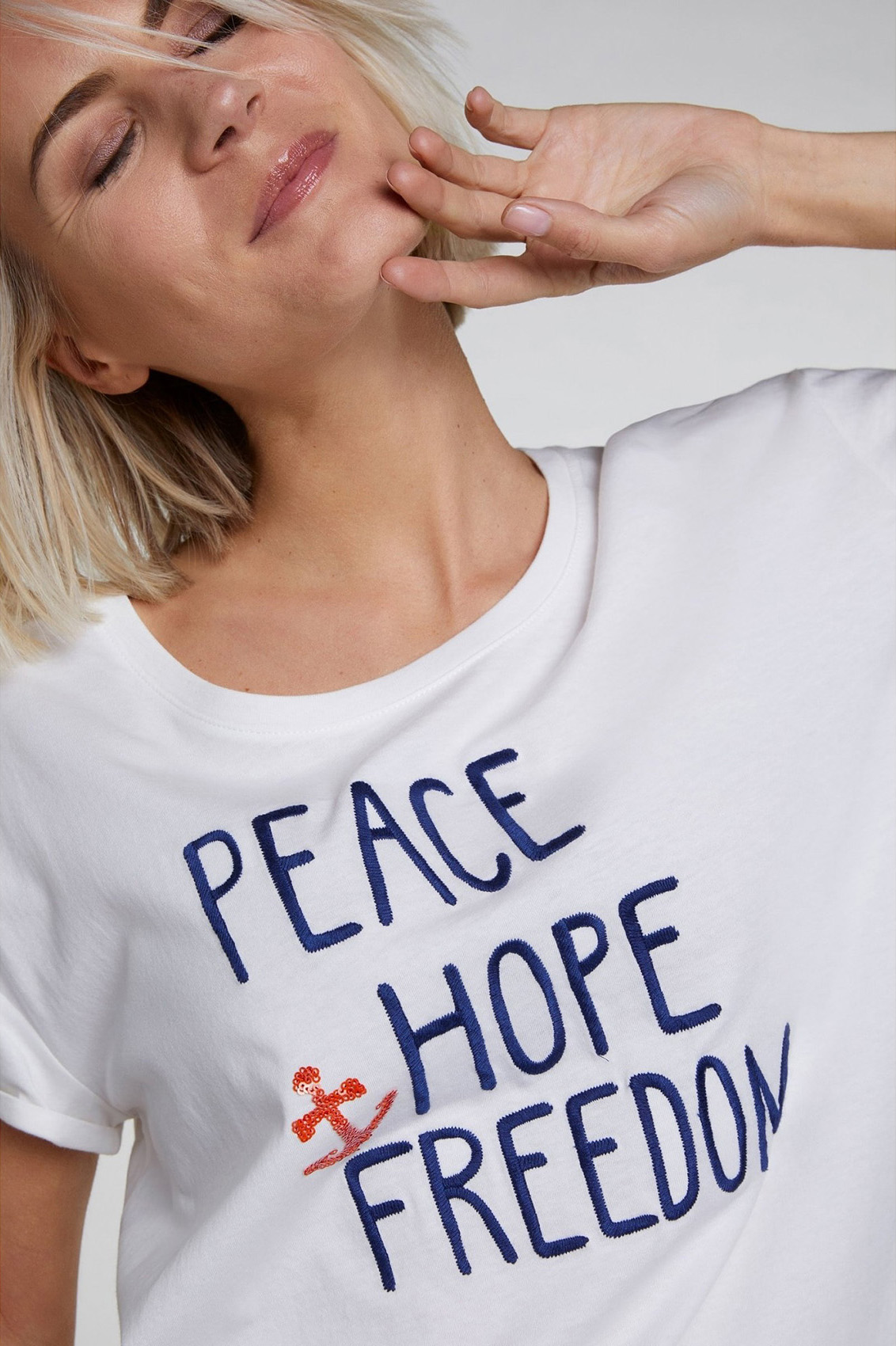 Для тех, кто скучает по морю! Футболка с вышивкой и пайетками. Модный свободный крой. Широкий круглый вырез горловины, короткие рукава со спущенным плечом. Контрастная отстрочка по низу изделия. Хлопковый материал приятен к телу и обеспечивает комфорт. Эта футболка - прекрасный компаньон для образа как с брюками, так и с юбкой.