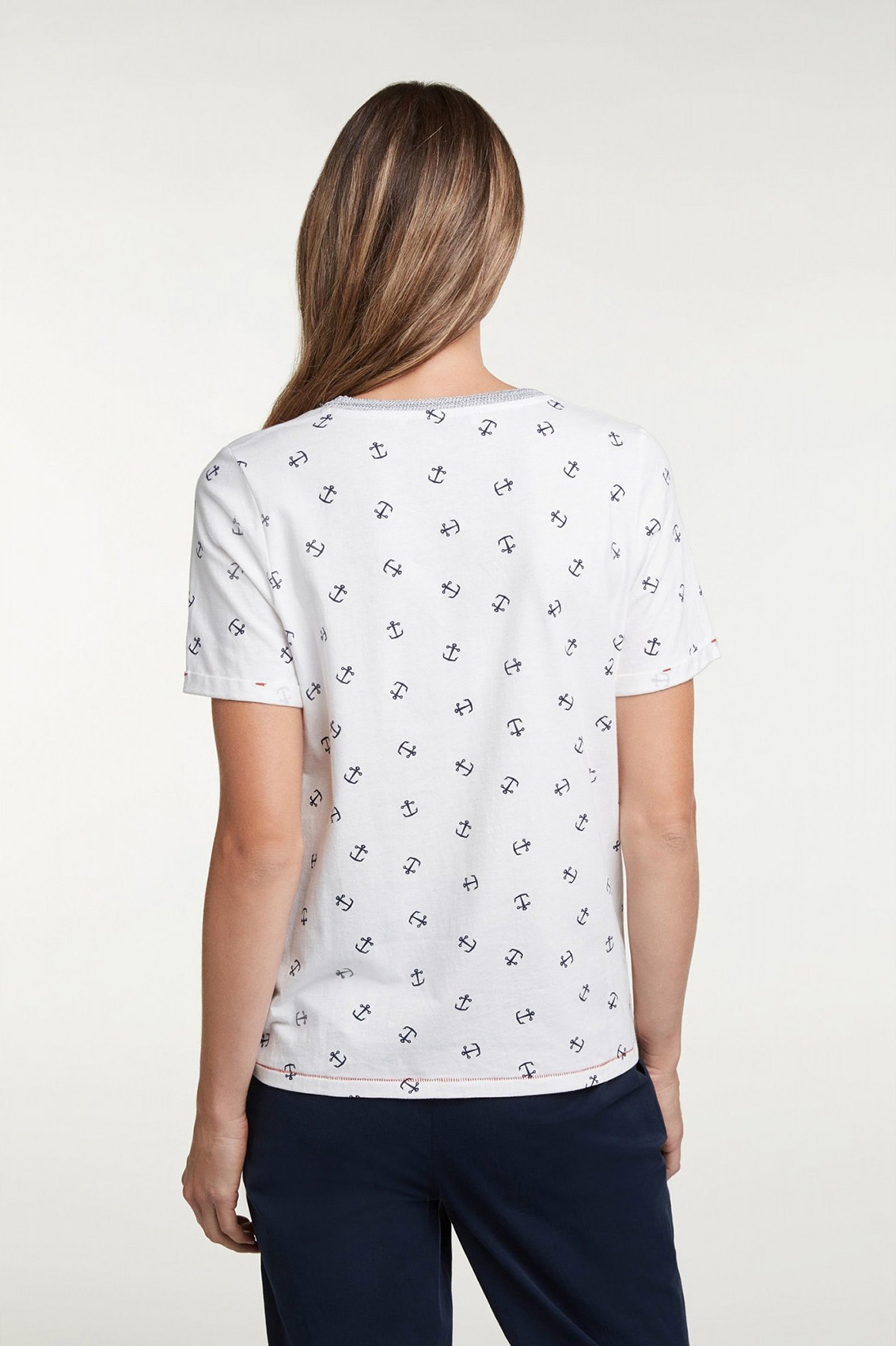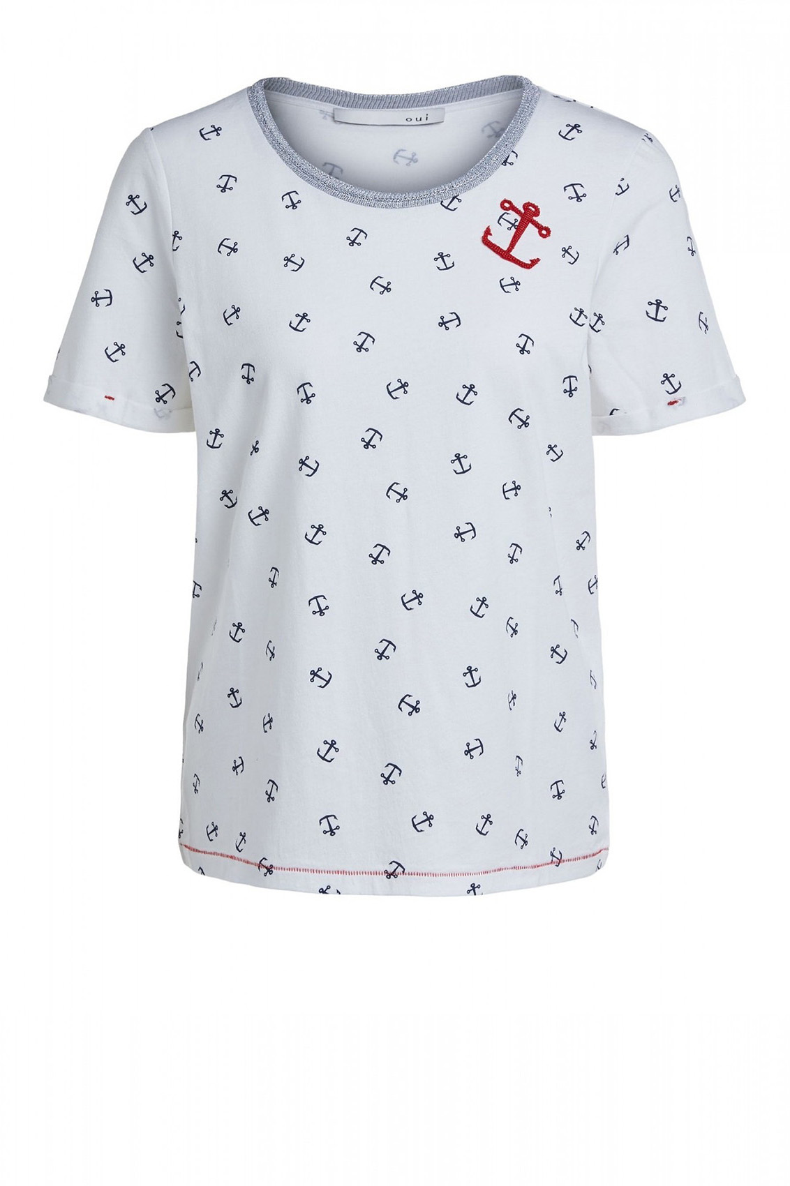 Для тех, кто скучает по морю! Футболка с принтом в виде якорей и украшением из бисера. Прямой крой. Широкий круглый вырез горловины с обтачкой, короткие рукава с фиксированными манжетами. Контрастная отстрочка по низу изделия. Хлопковый материал приятен к телу и обеспечивает комфорт. Эта футболка - прекрасный компаньон для образа как с брюками, так и с юбкой.
