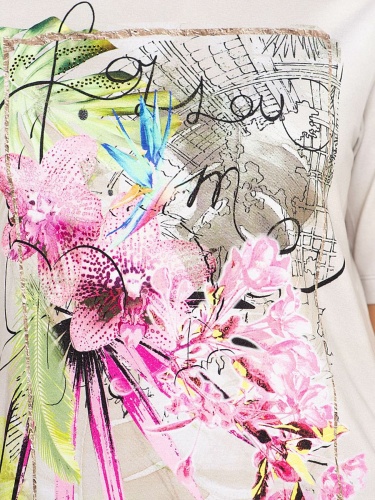 Мечтаете о тропиках? Тогда эта футболка - именно то, что нужно! Приятная расцветка и трендовый принт с изображением экзотических цветов перенесет вас в теплые края. Мягкий материал из смеси вискозы и эластана гарантирует отличную посадку, а рукав 1/2 придает образу легкость и непринужденность. Футболка будет замечательным компаньоном как в брючном, так и в юбочном комплекте.