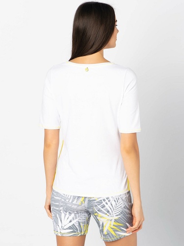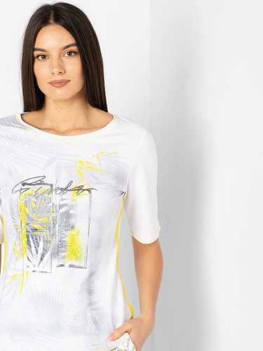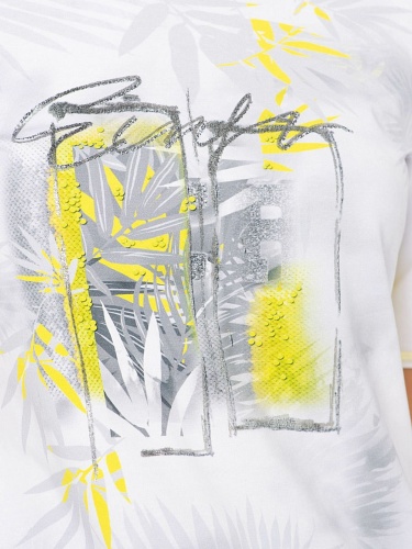 Футболка с трендовым тропическим принтом и яркими акцентами. Яркая декоративная отстрочка. Слегка приталенный силуэт. Вырез "лодочка". Рукава 1/2. Приятный к телу материал из смеси хлопка и эластана. Длина изделия по спинке: 65 см.
