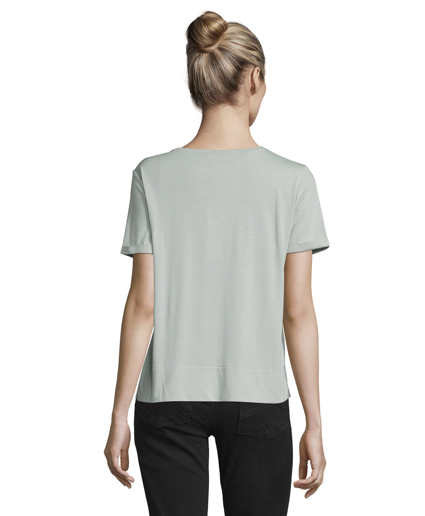 Футболка слегка приталенного силуэта подчеркивает достоинства фигуры. Круглый вырез горловины, короткие рукава с фиксированными манжетами. Металлизированный принт с надписью. Эта универсальная модель будет отлично смотреться как с брюками, так и с юбкой.