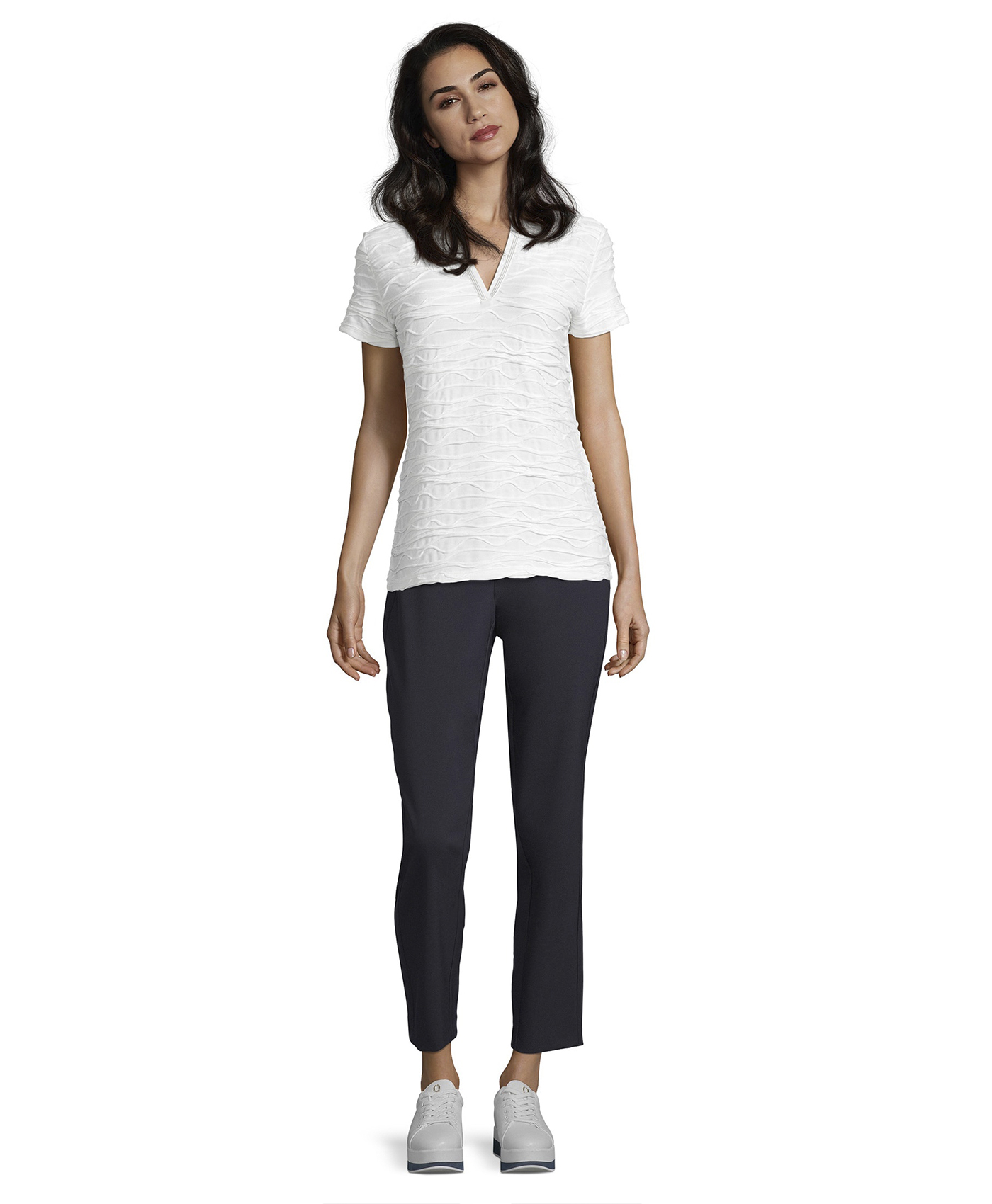 Однотонная футболка прямого покроя - абсолютно необходимая вещь в гардеробе. Короткие рукава, V-образный вырез горловины с отделкой тесьмой. Интересная фактура ткани привлекает внимание. Футболка отлично сочетается как с брюками, так и с юбкой.